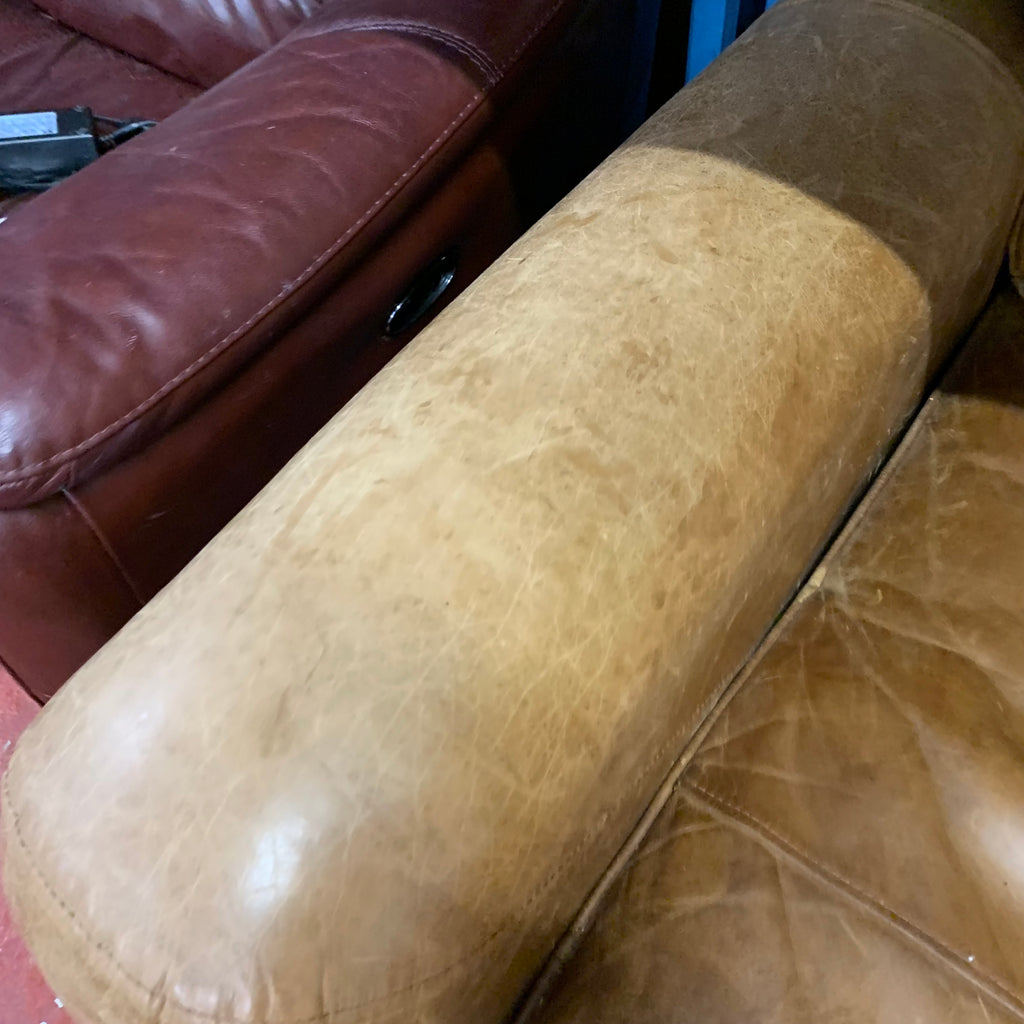 Brown tan distressed leather 2 seater sofa.