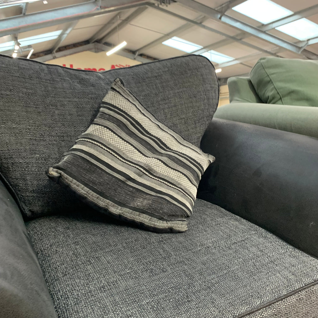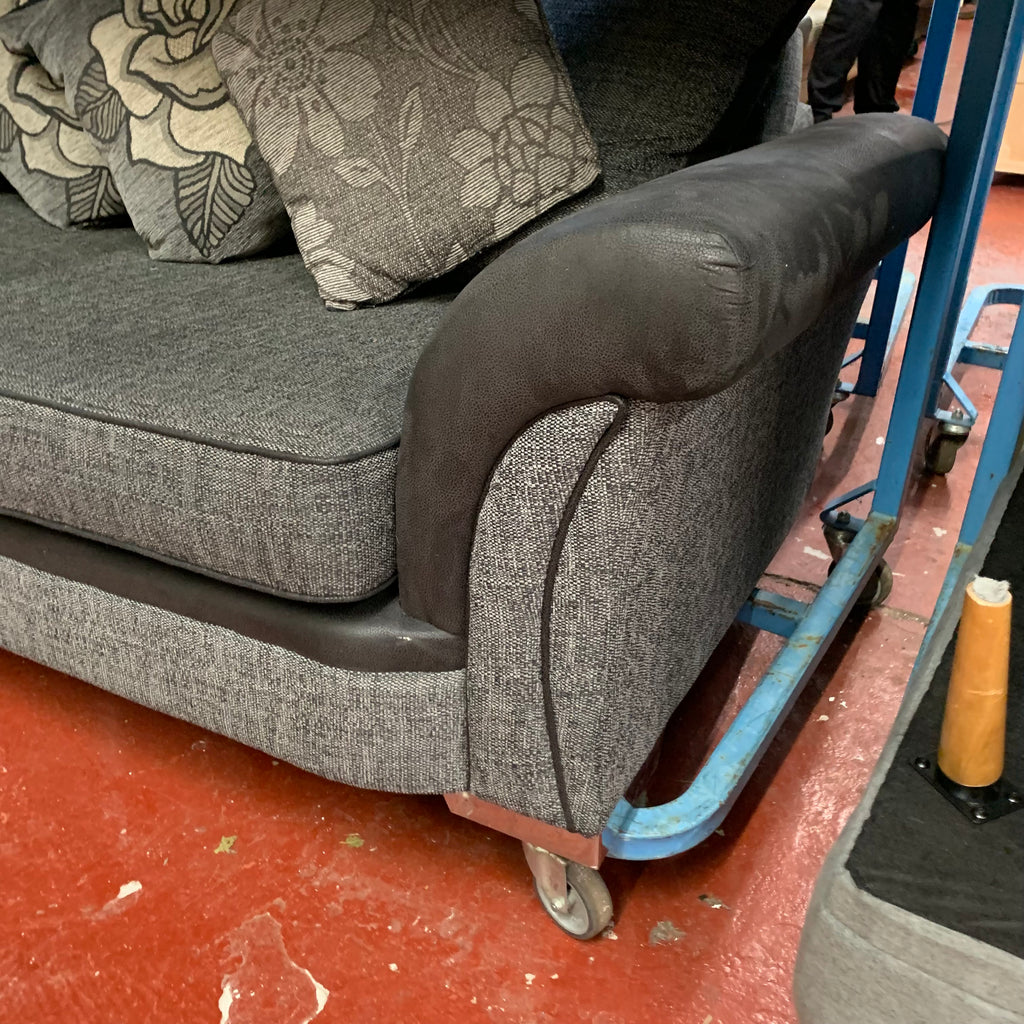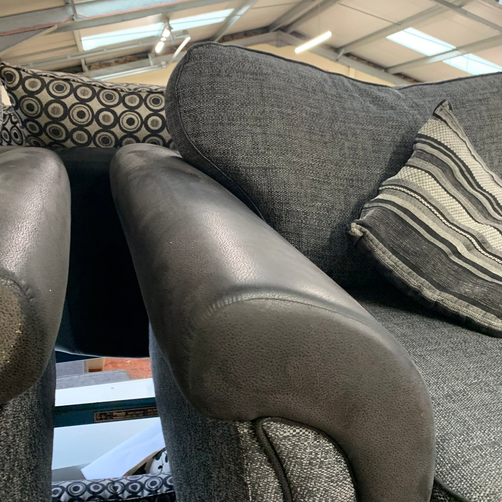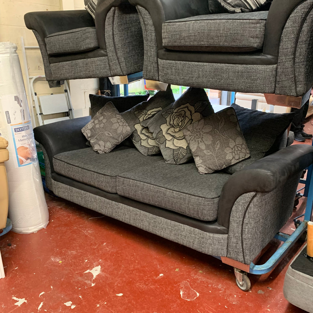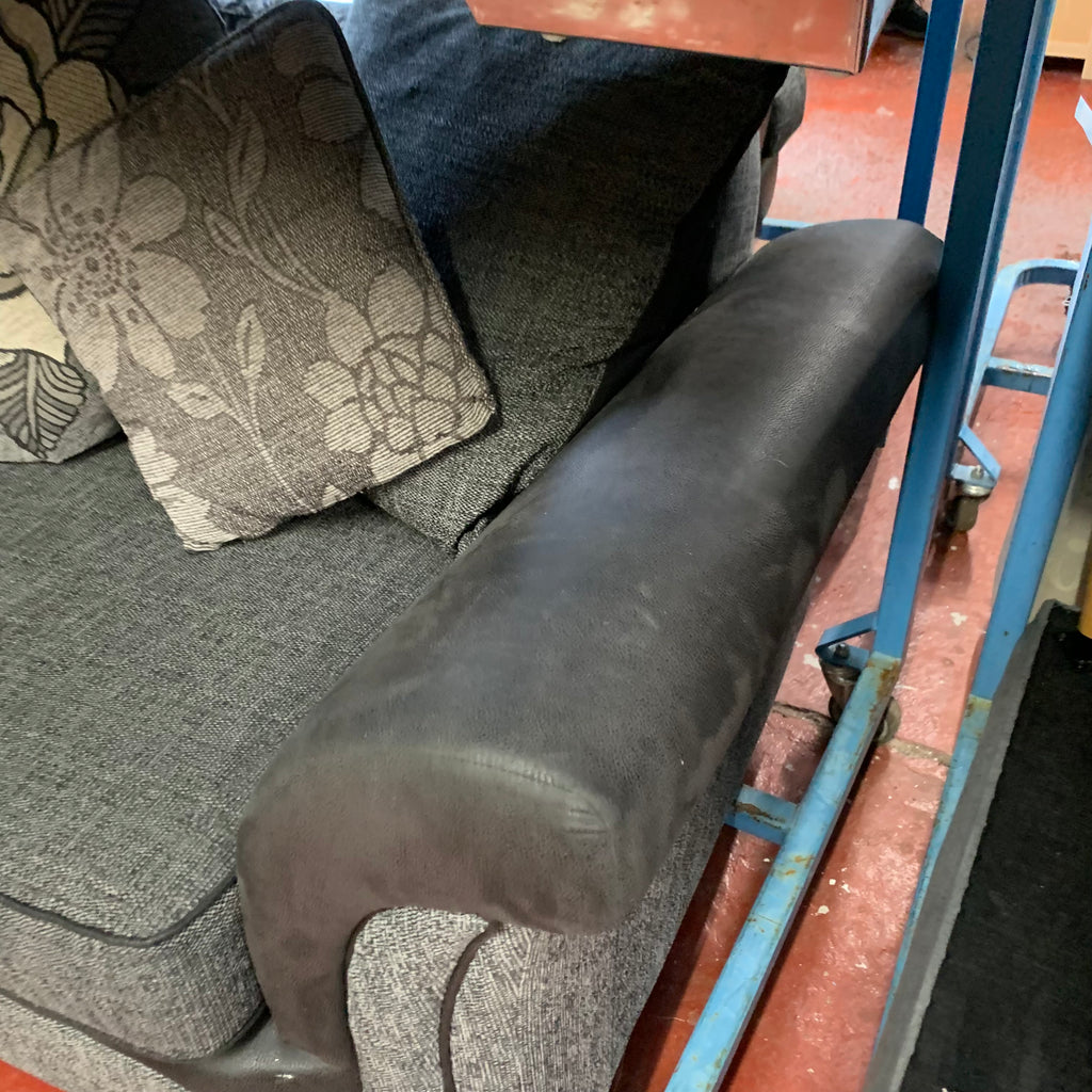 Two tone grey 3 seater sofa with cushions and 2x matching armchairs.