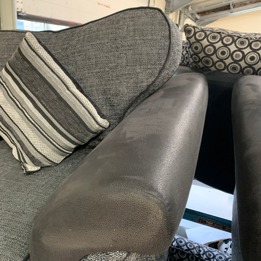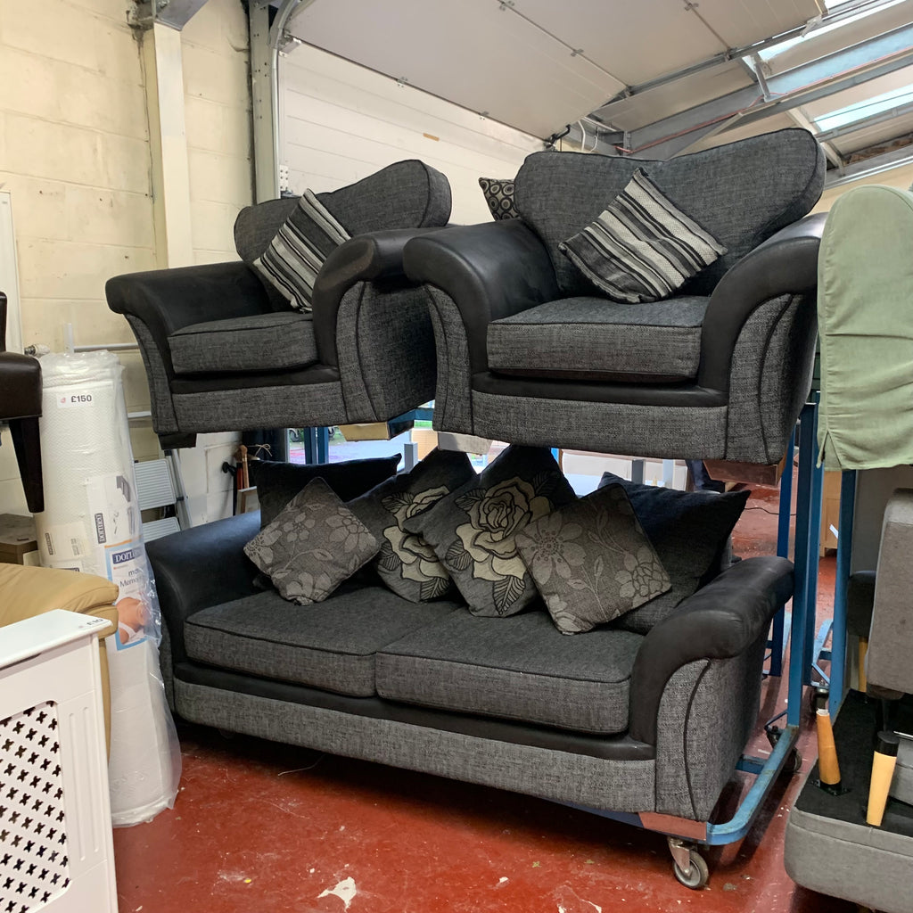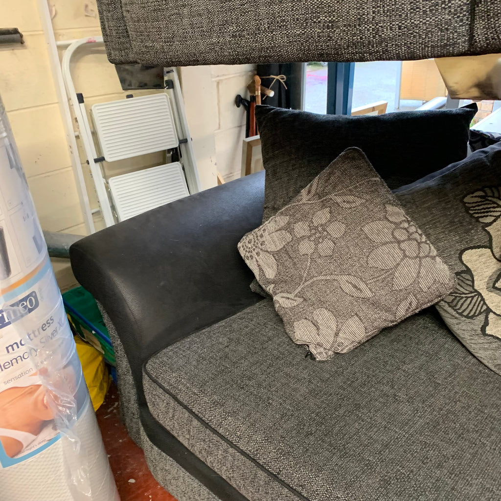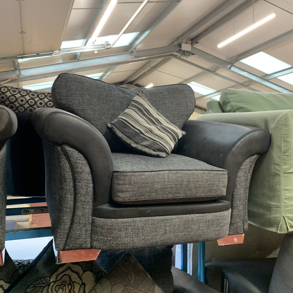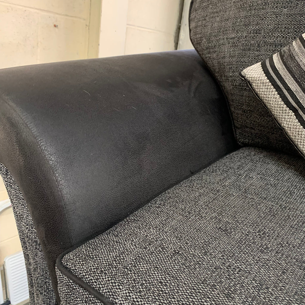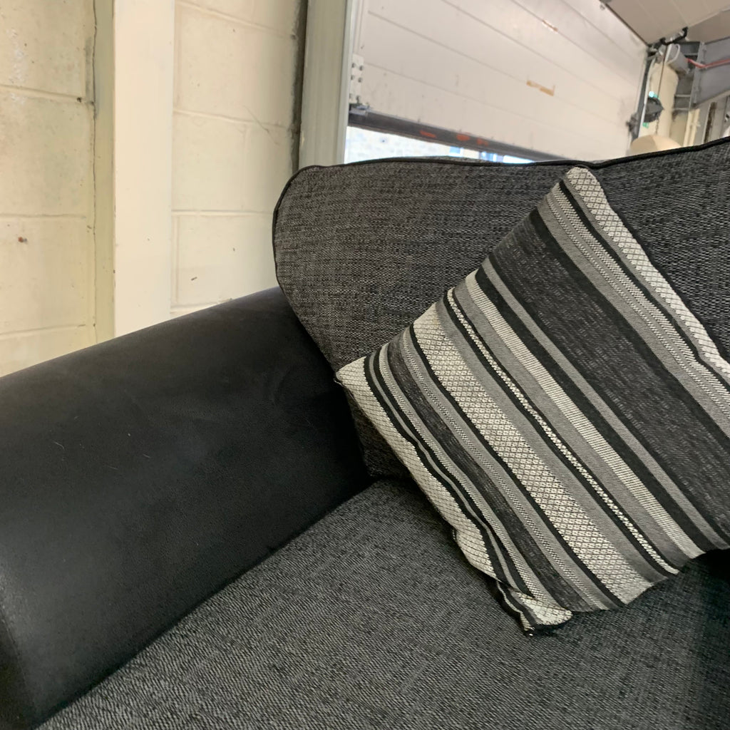 Two tone grey 3 seater sofa with cushions and 2x matching armchairs.