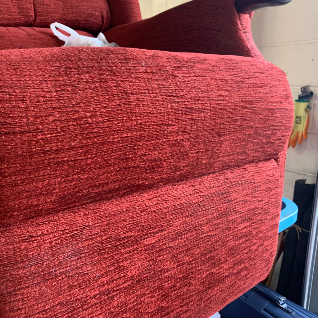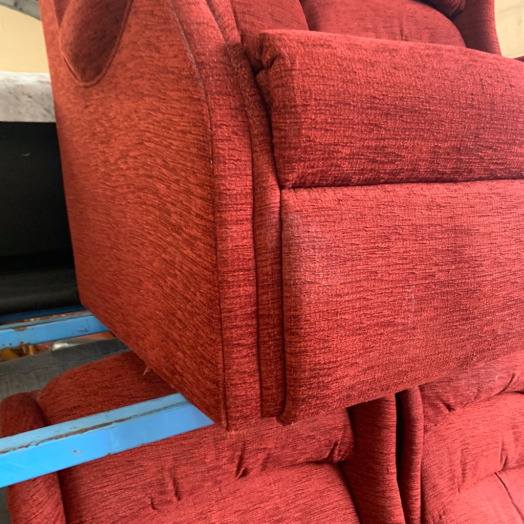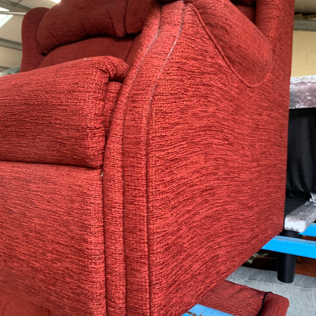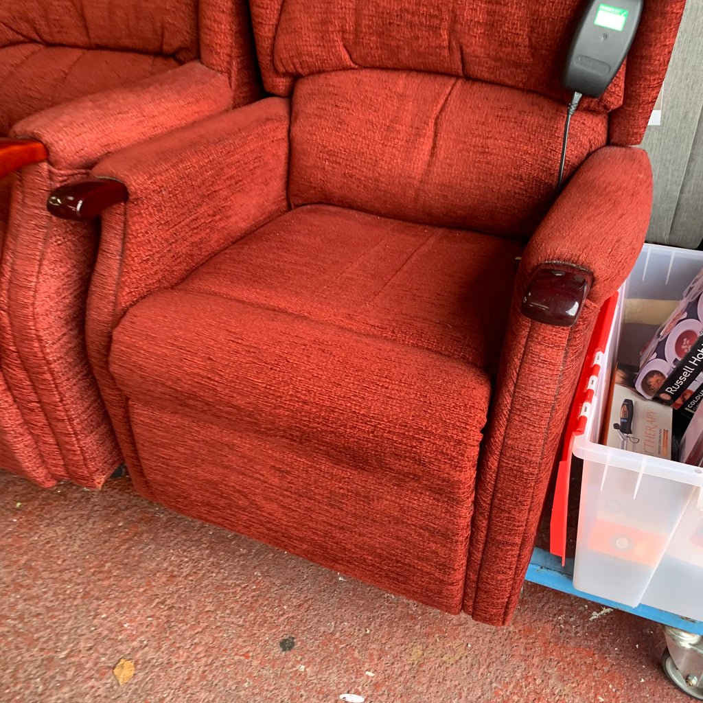 Red 2 seater sofa with matching armchair and rise and recliner armchair with remote.