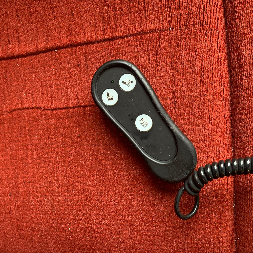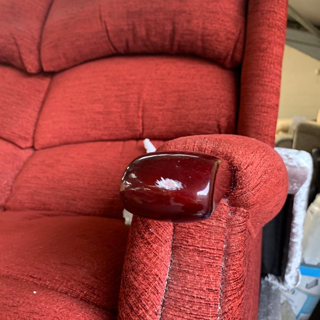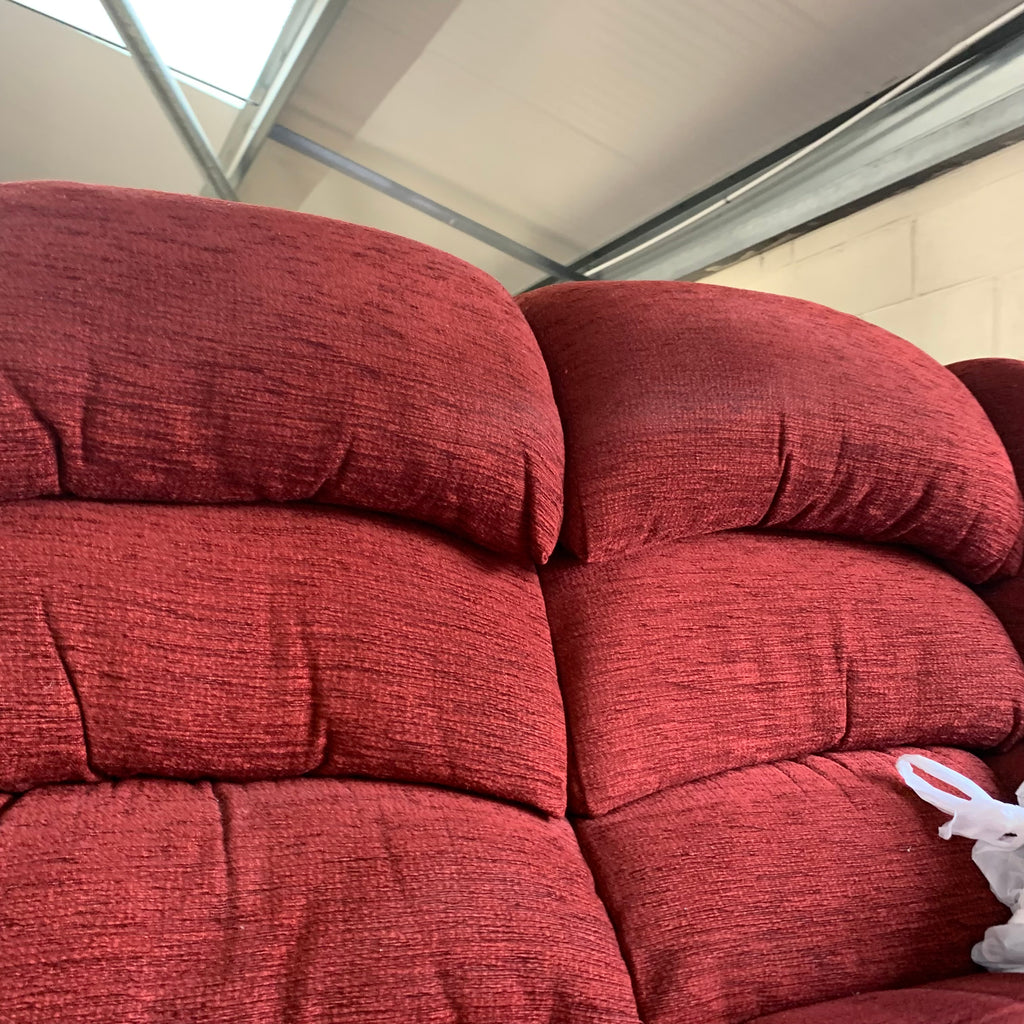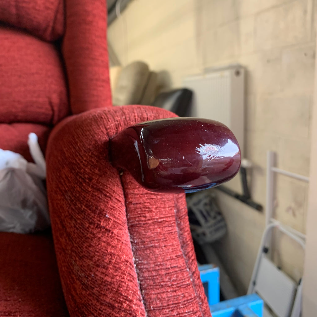 Red 2 seater sofa with matching armchair and rise and recliner armchair with remote.