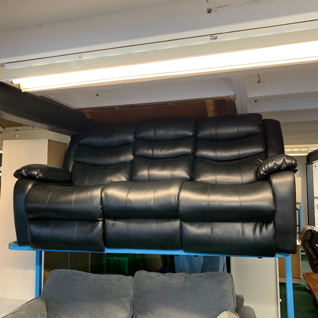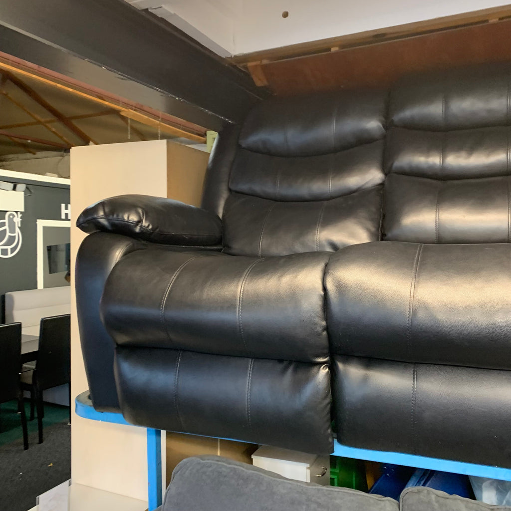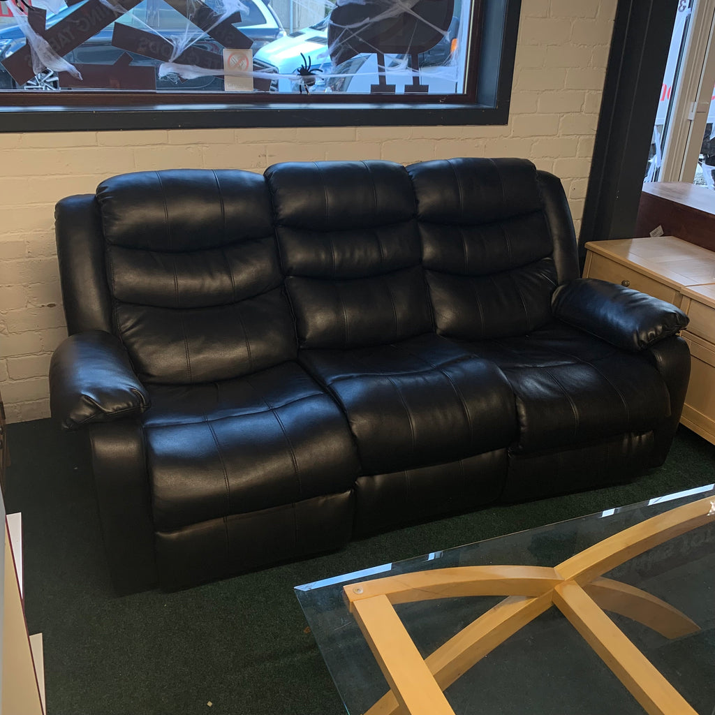 Black leather 3 seater manual recliner sofa with cup holders.