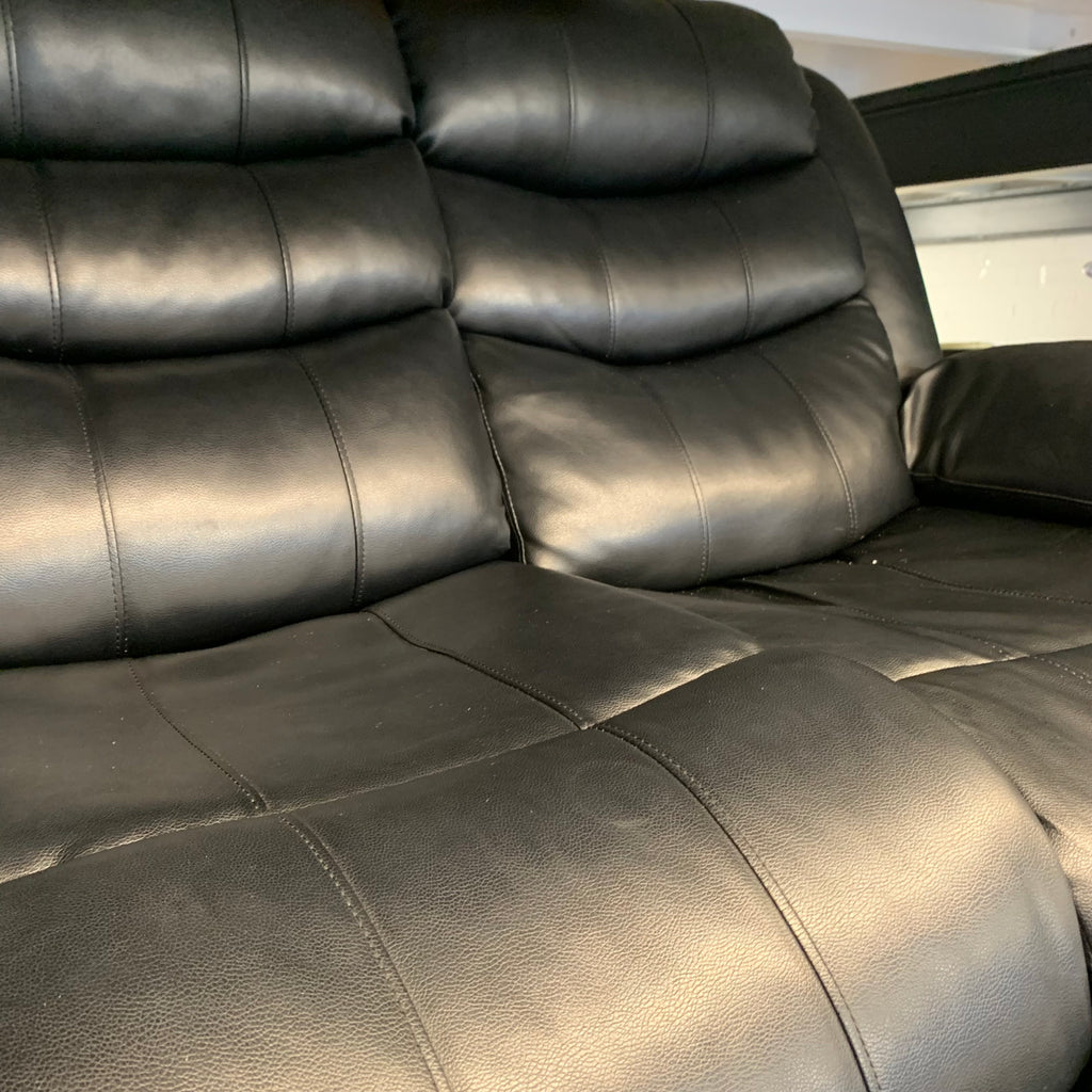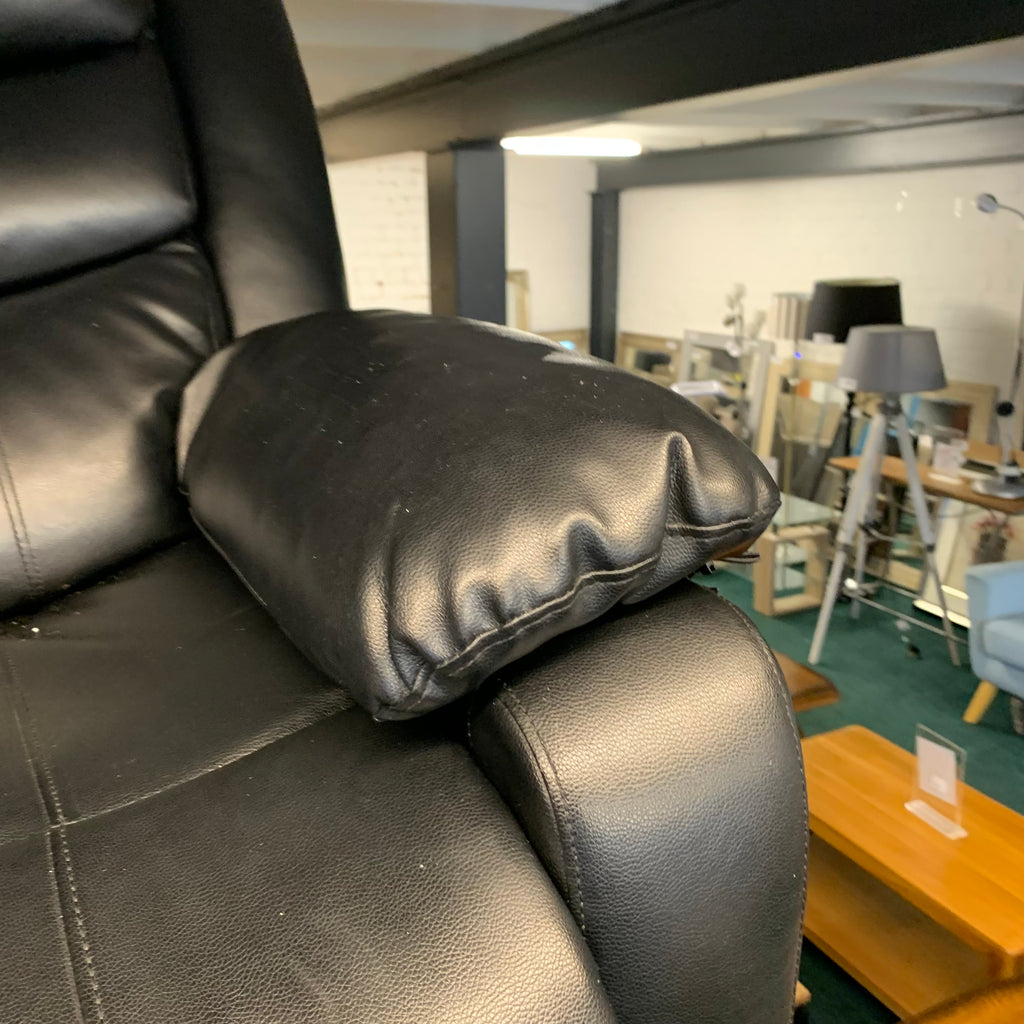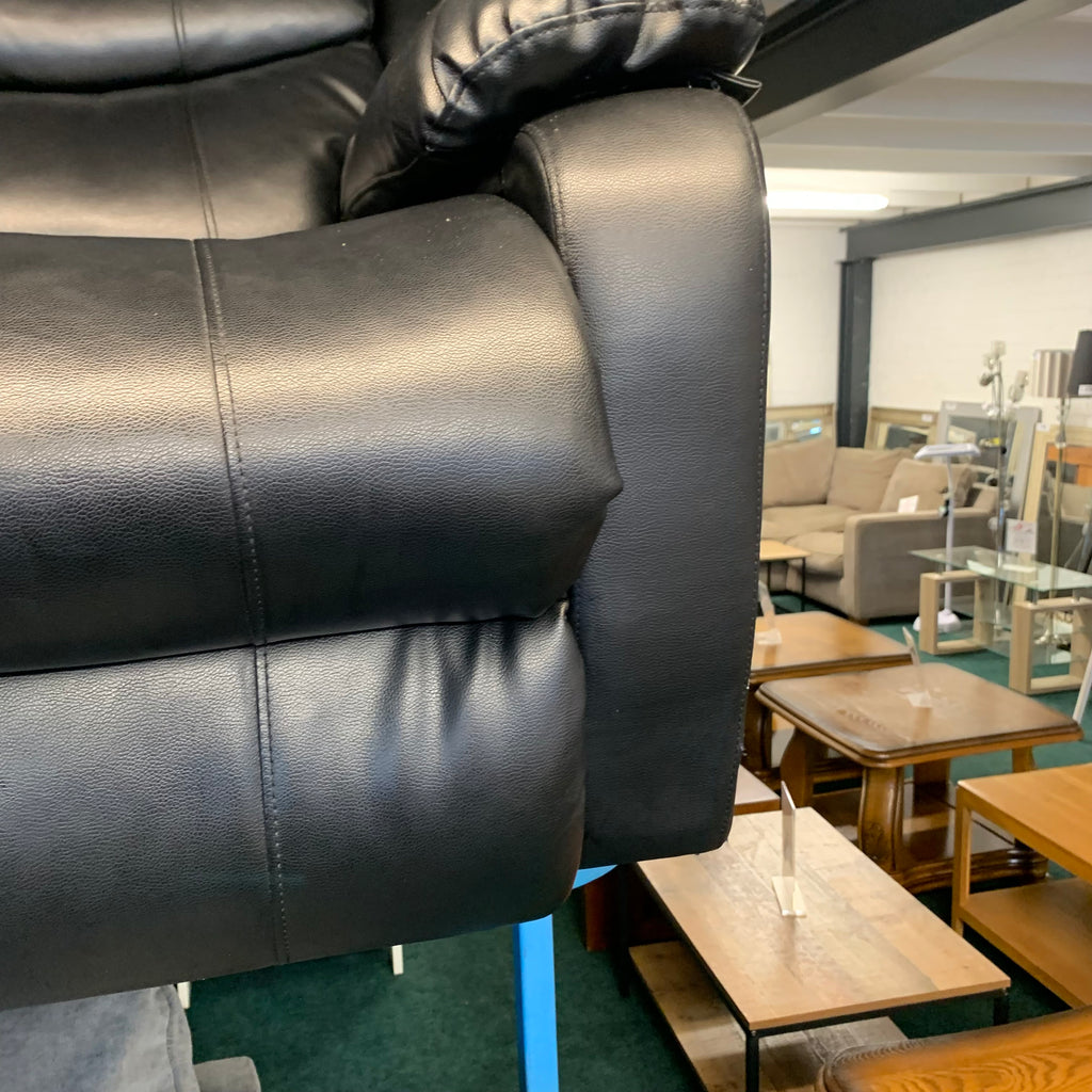 Black leather 3 seater manual recliner sofa with cup holders.