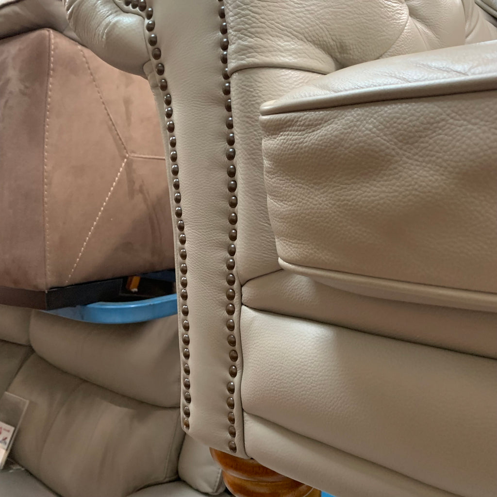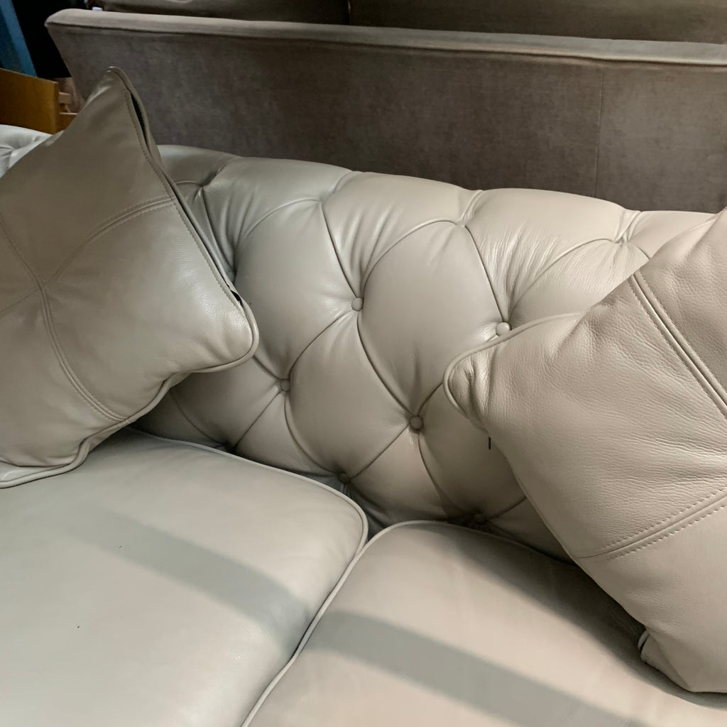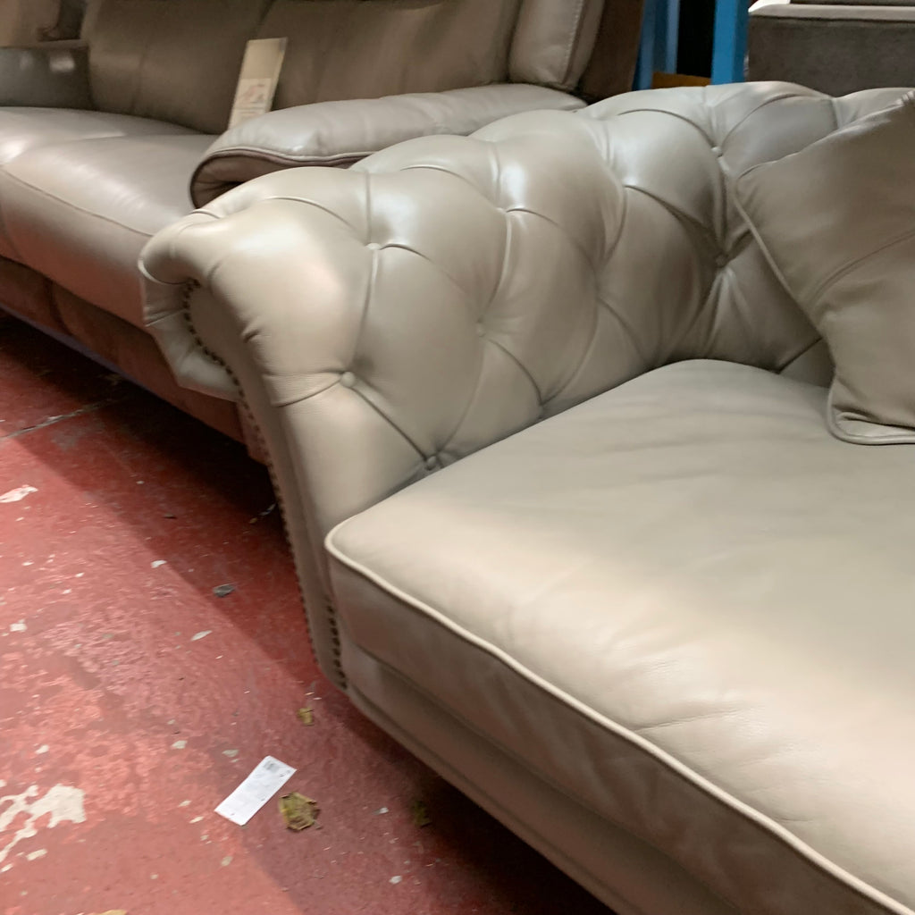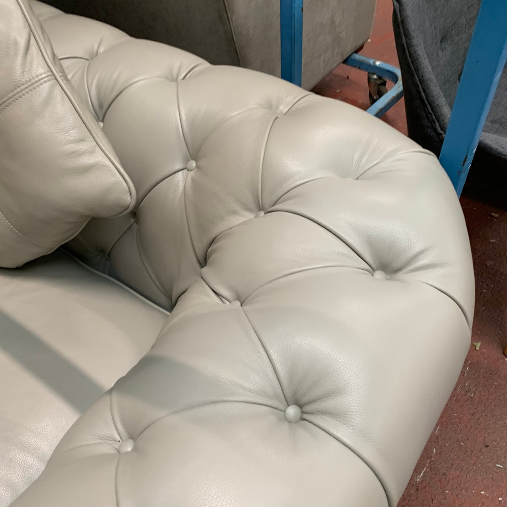 Large light grey 4 seater sofa with button details, cushions and matching armchair.