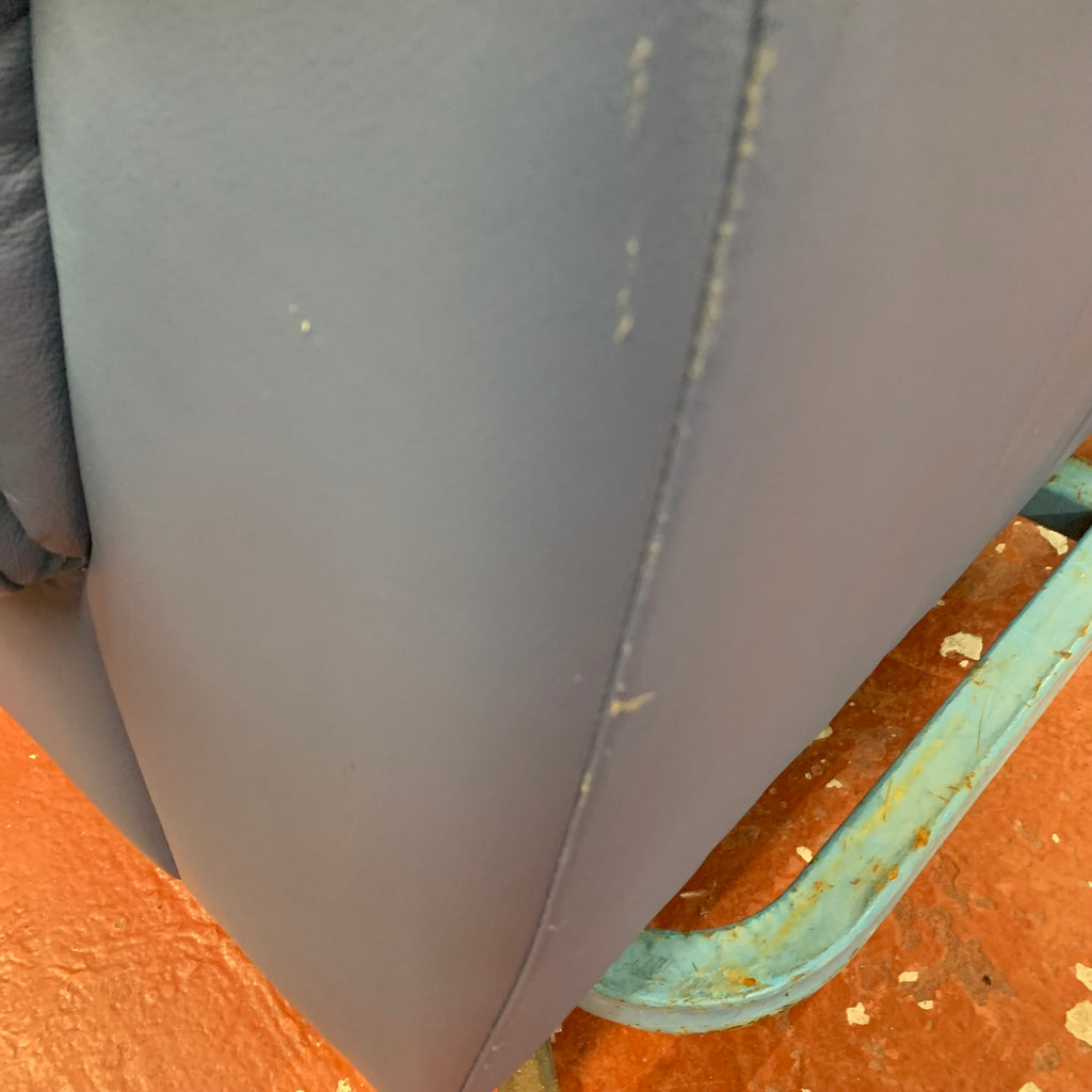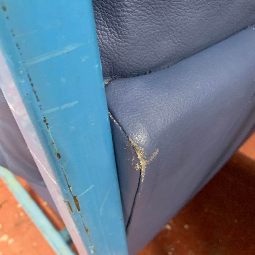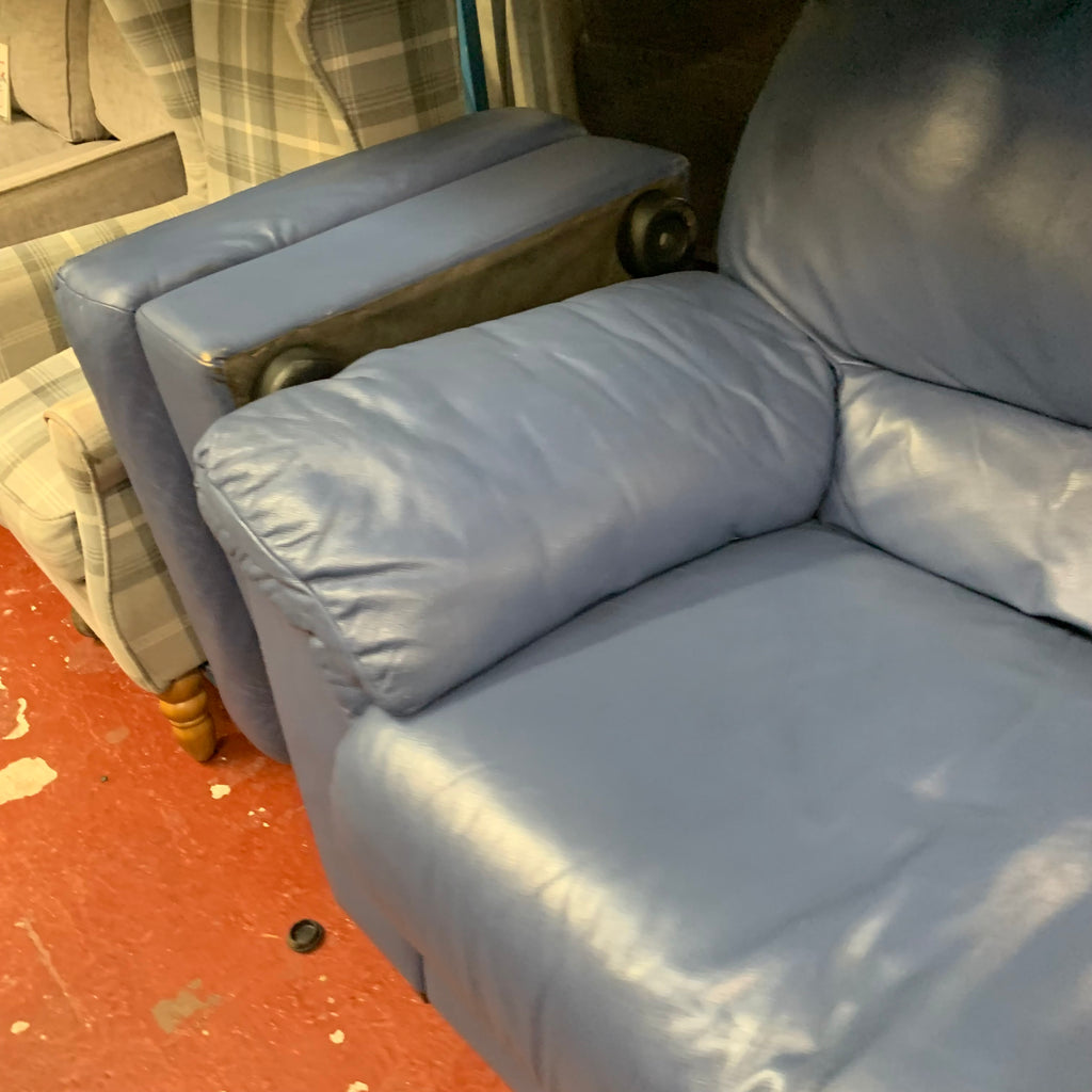 Blue leather armchair with matching footstool.