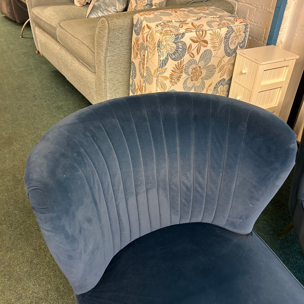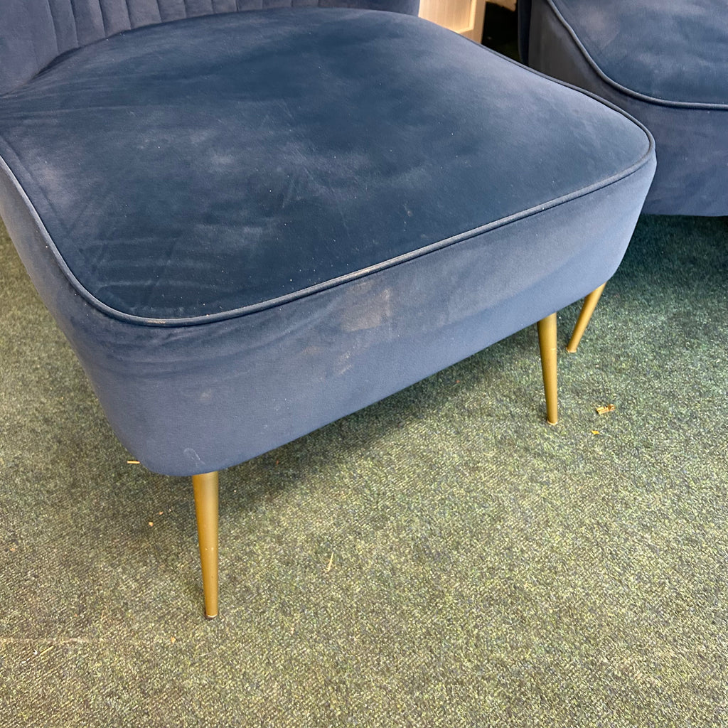 Navy blue velvet bedroom chair with gold legs.