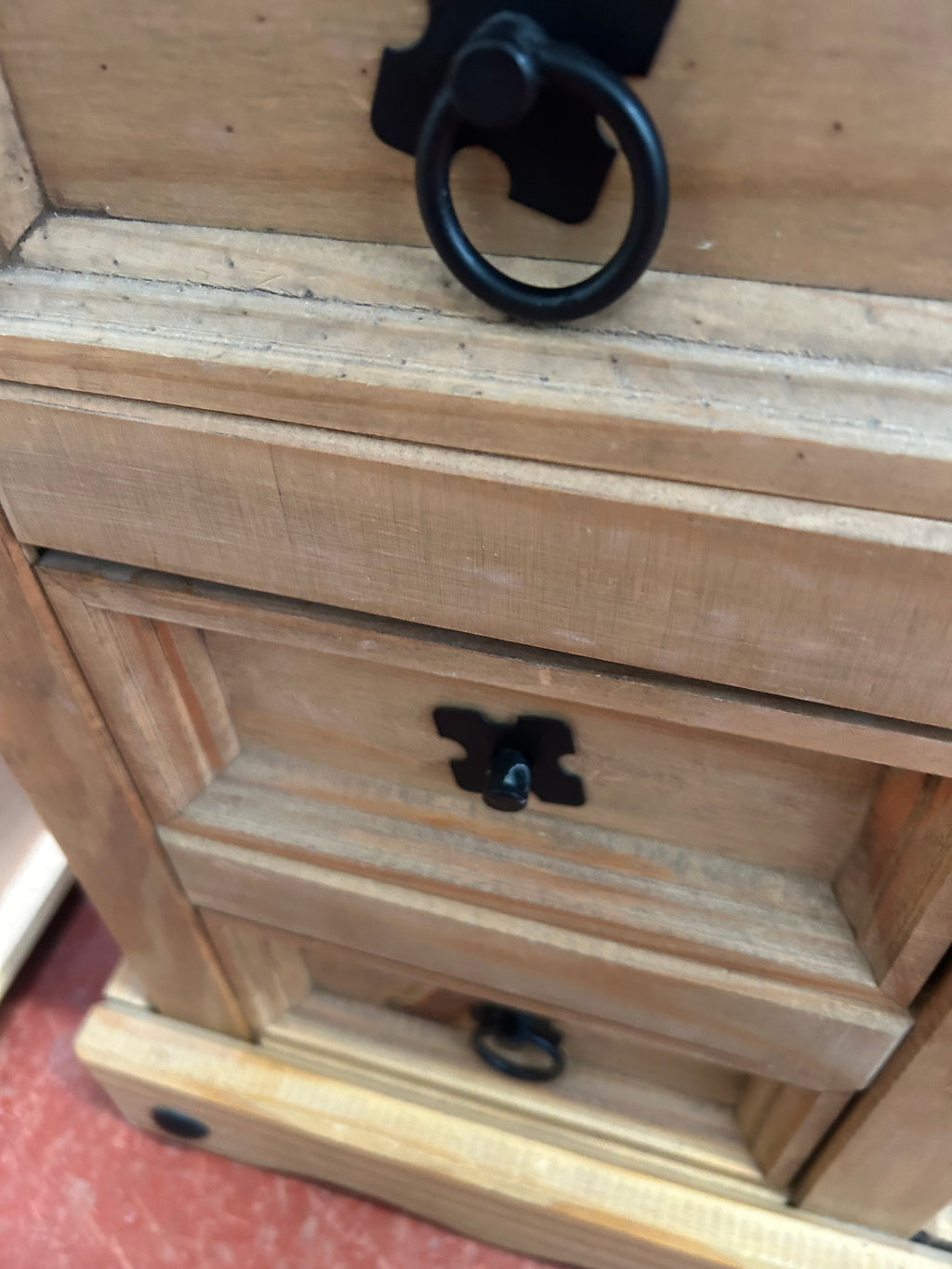 Handle is missing from one of the drawers. Has slight marks to wood. Price includes both.