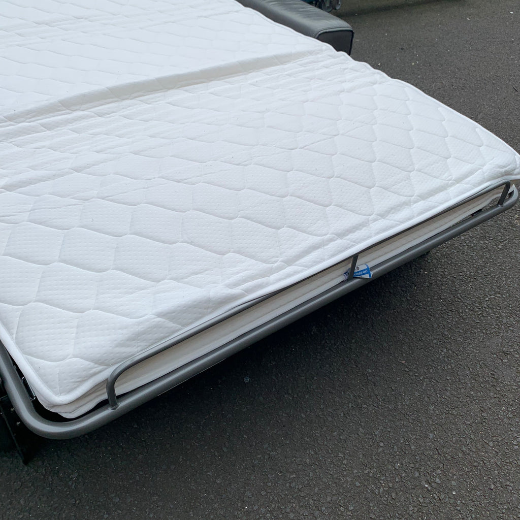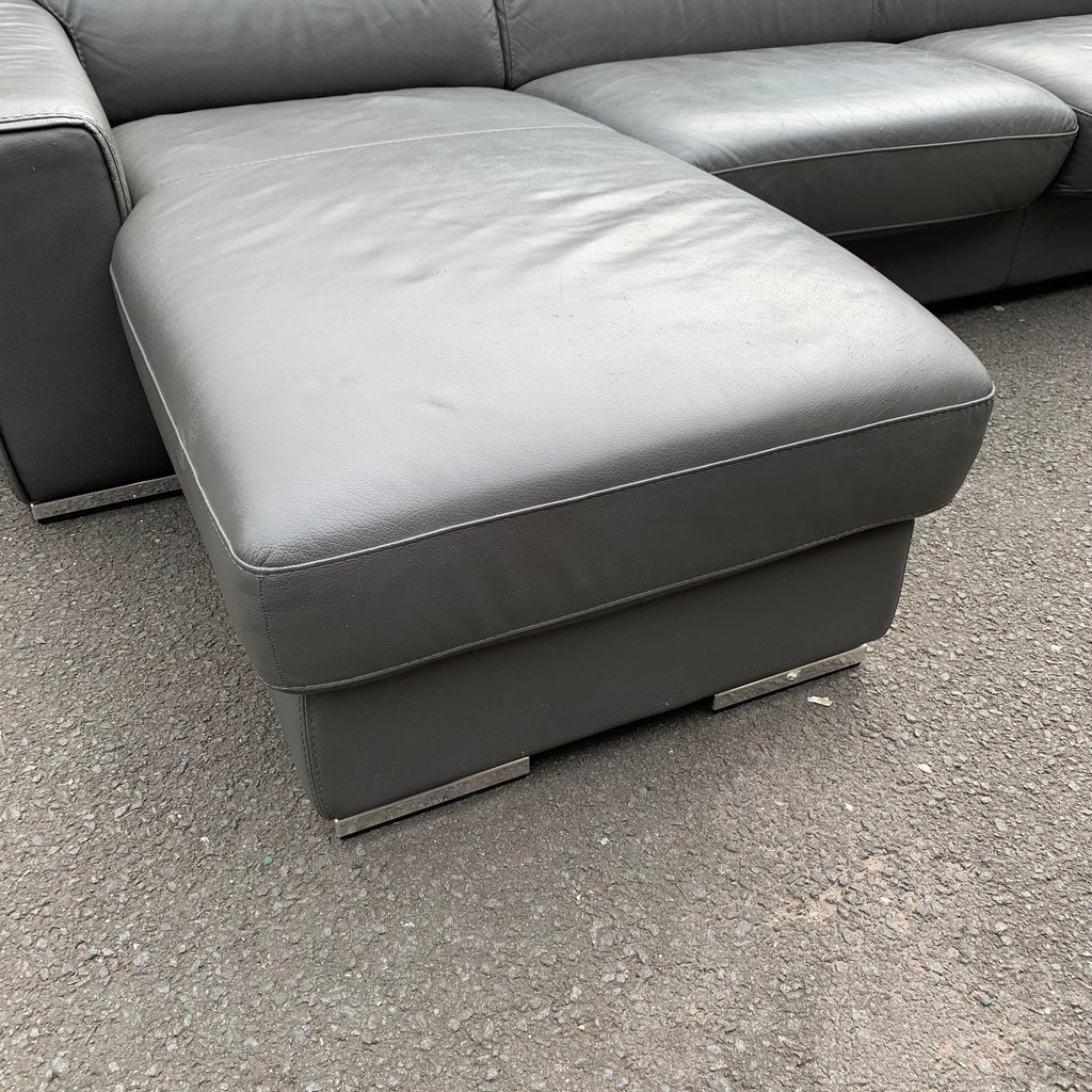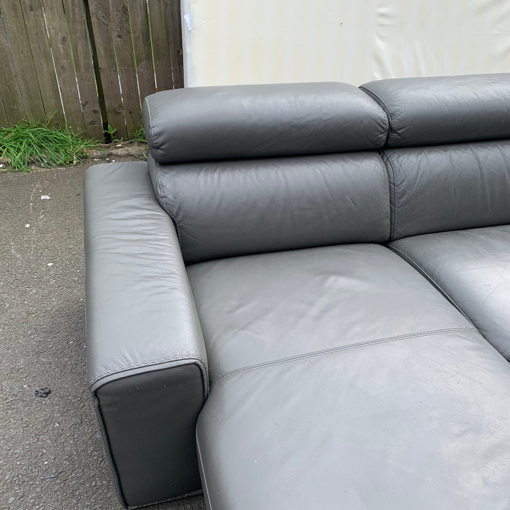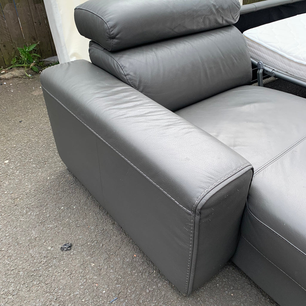 Large dark grey leather corner sofa bed with adjustable head rests and ottoman storage space.