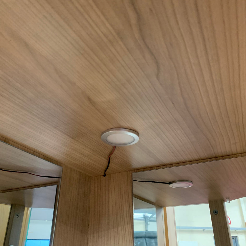 Wooden and glass display cabinet with lights.
