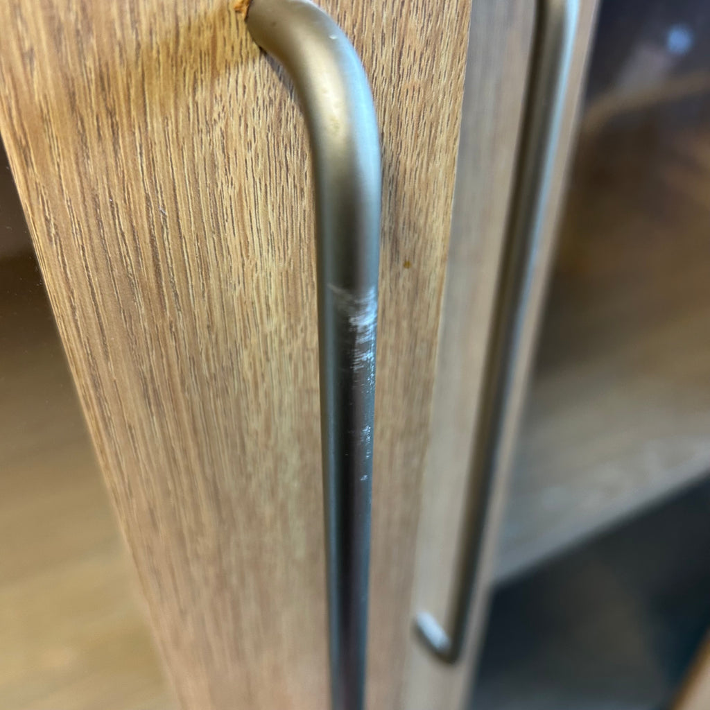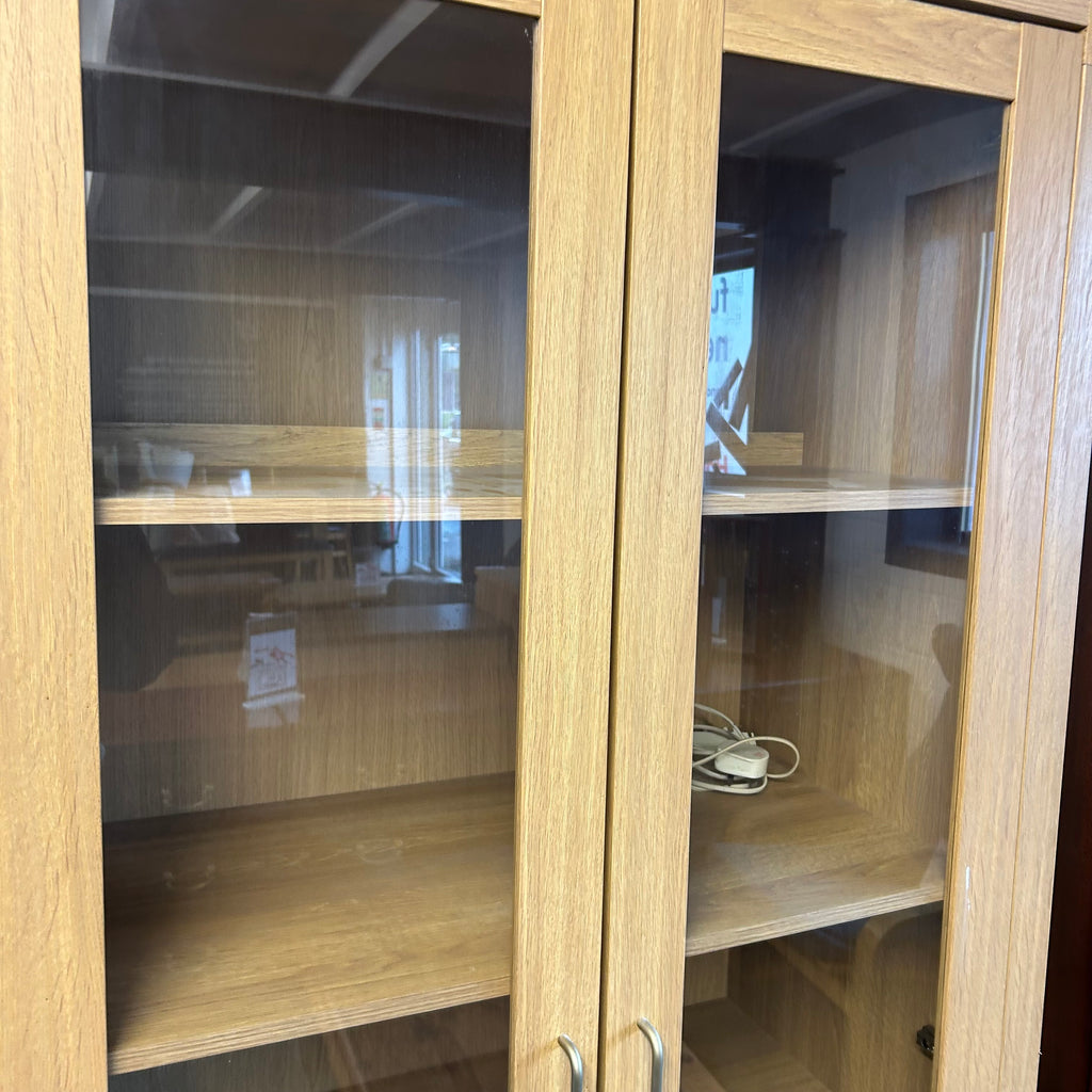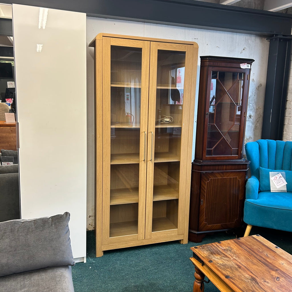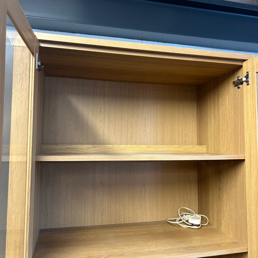 Tall wooden display cabinet with glass doors and lights.