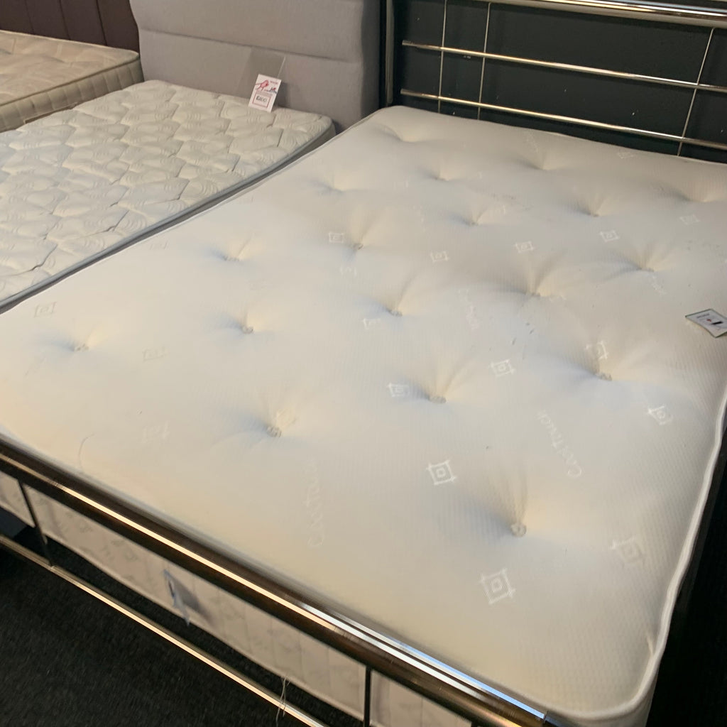 Double metal bed frame with mattress.