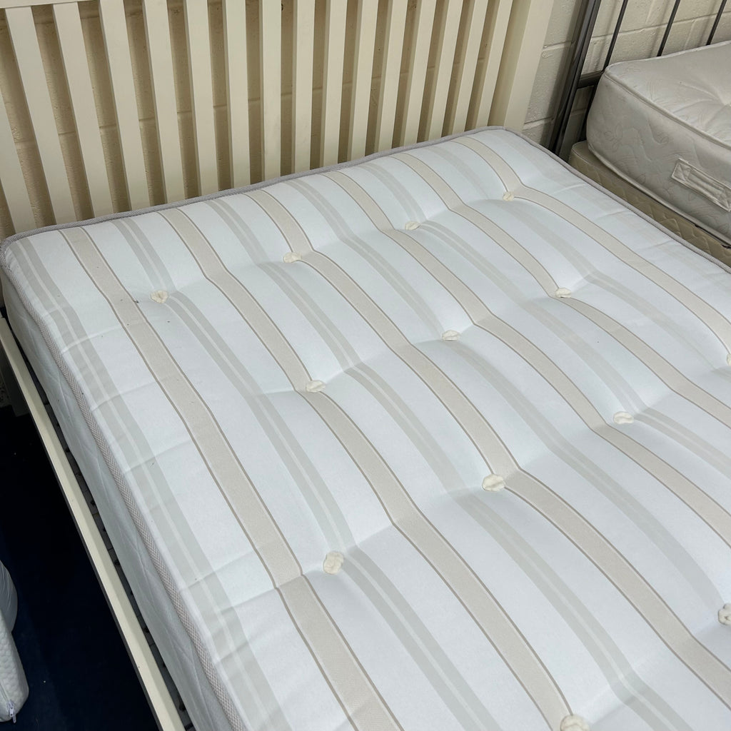 Cream wooden double bed frame with mattress.