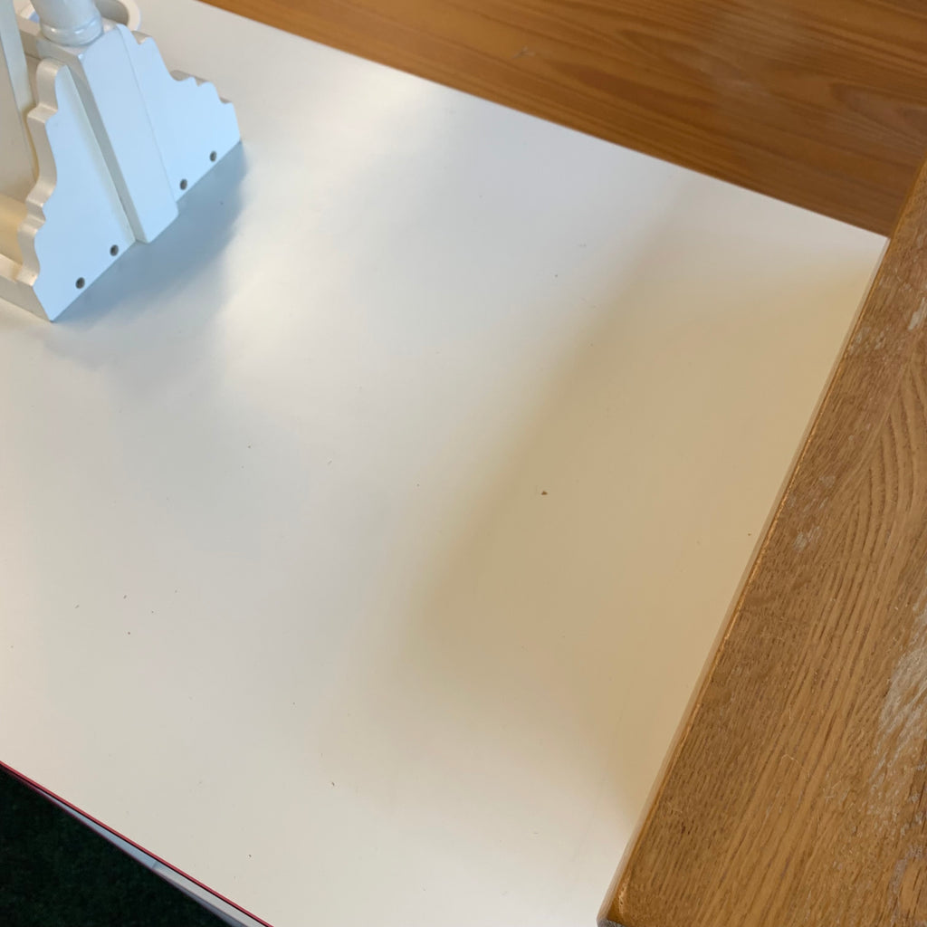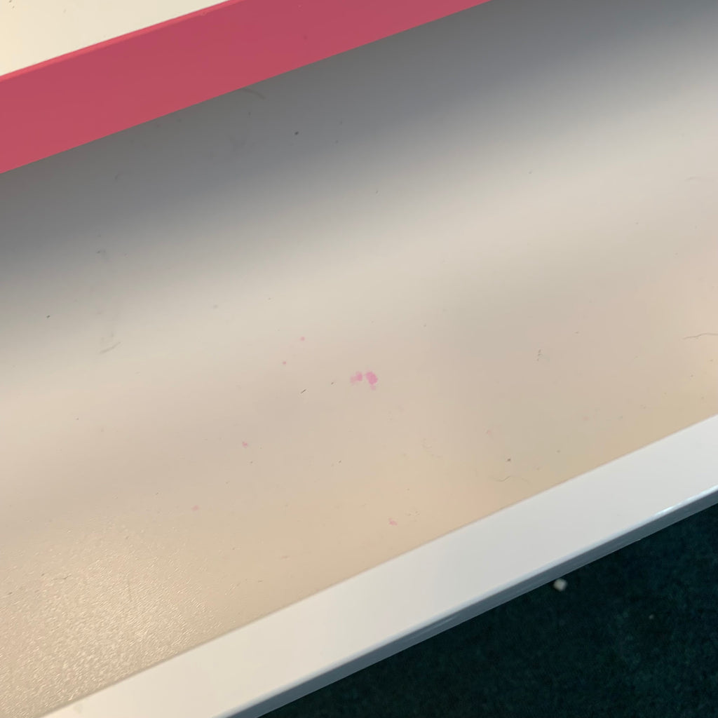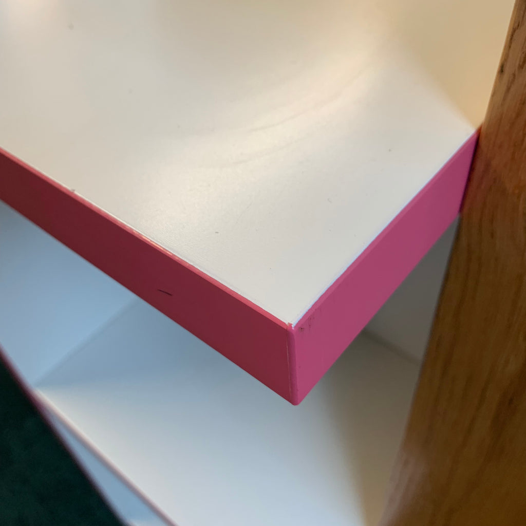 White dressing table with 1x drawer, shelves, mirror and painted pink details.