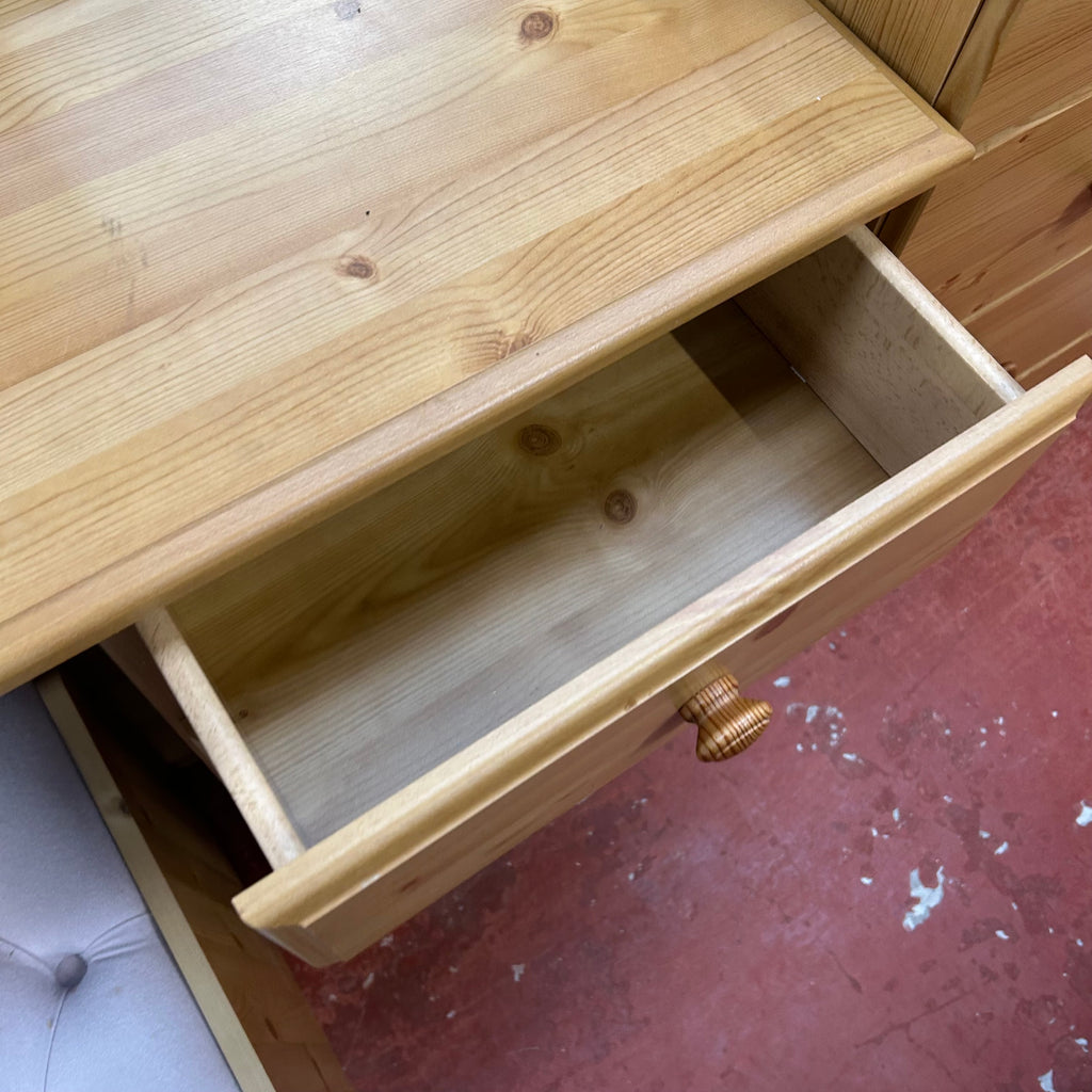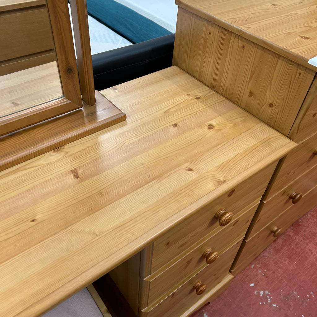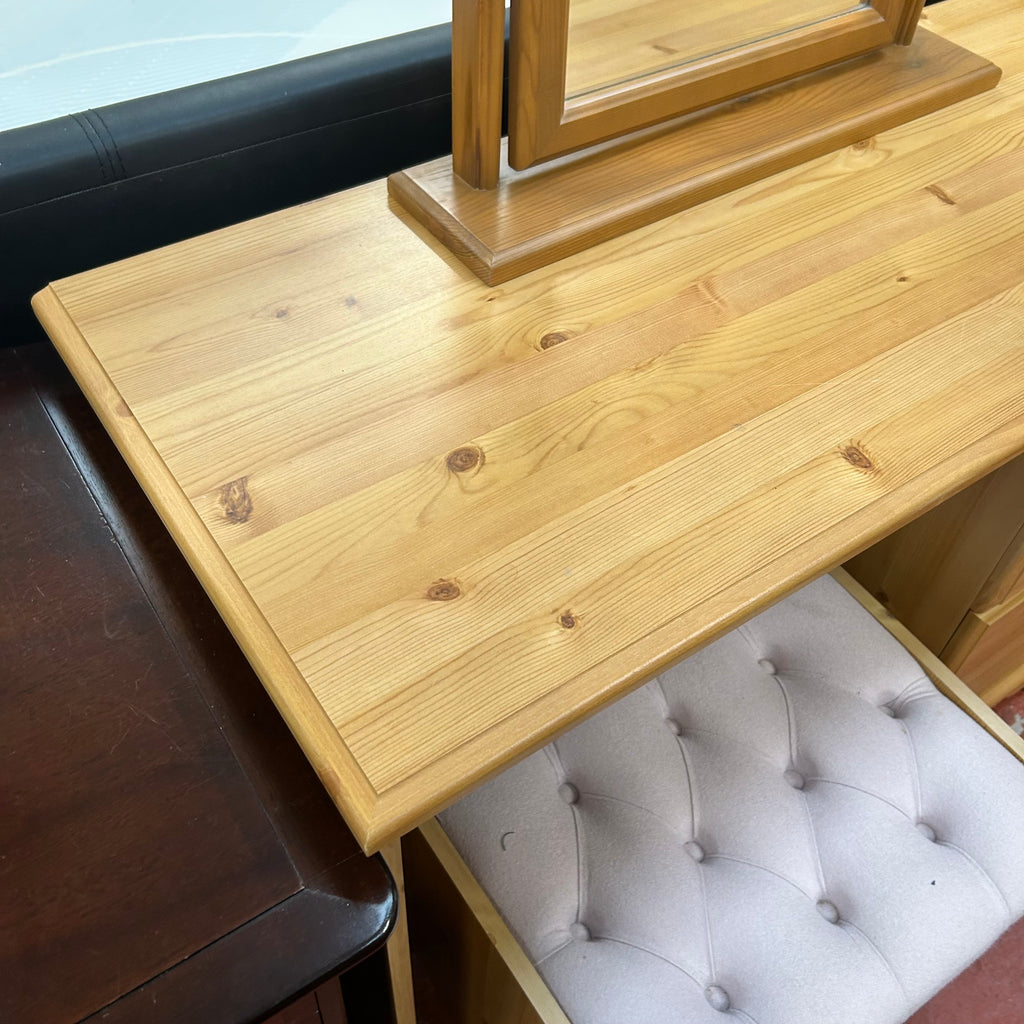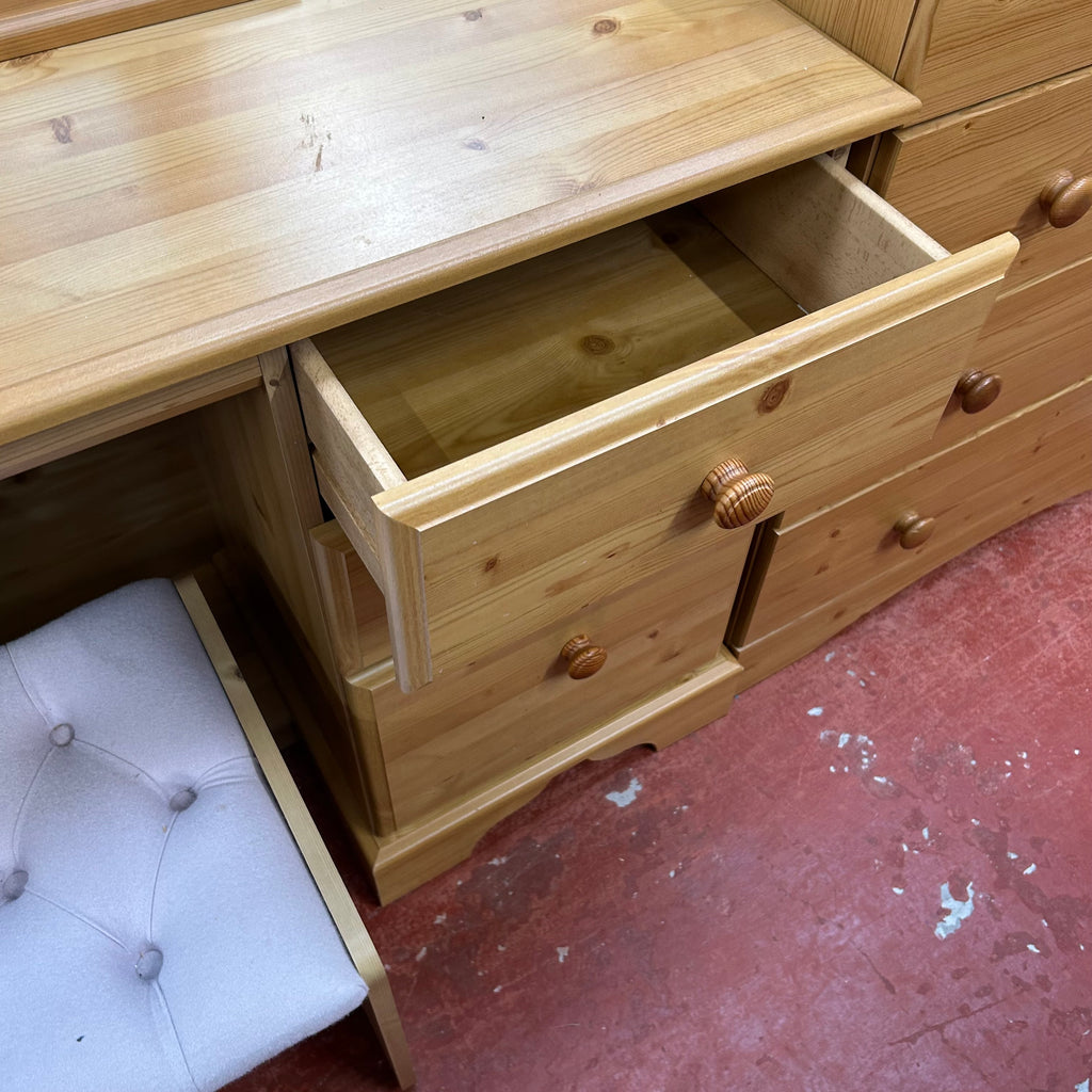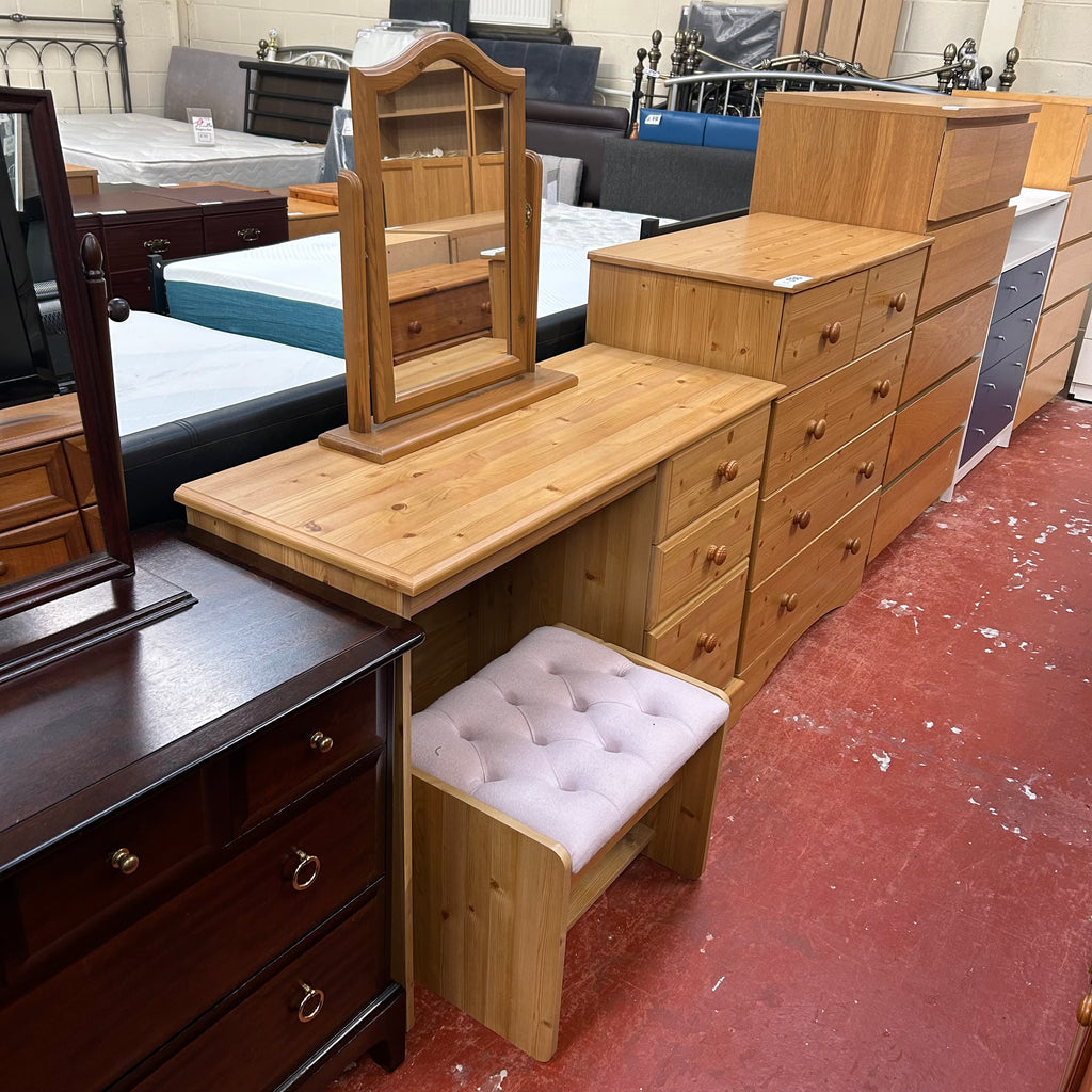 Wooden dressing table with 3x drawers, mirror and stool.