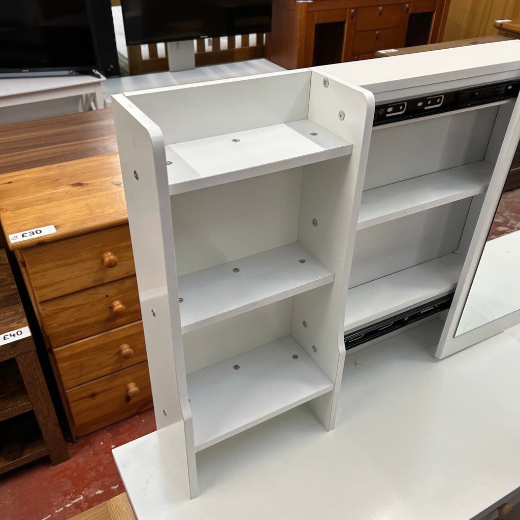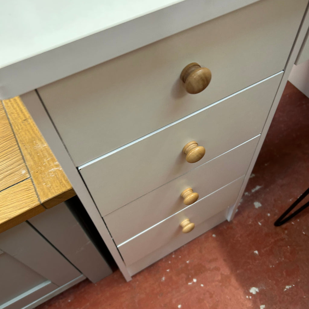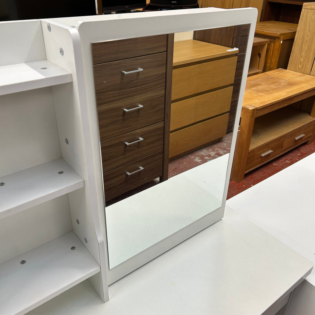White kids dressing table with drawers, sliding storage mirror and grey stool.