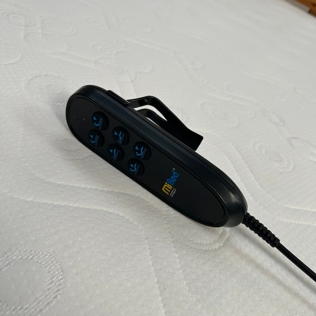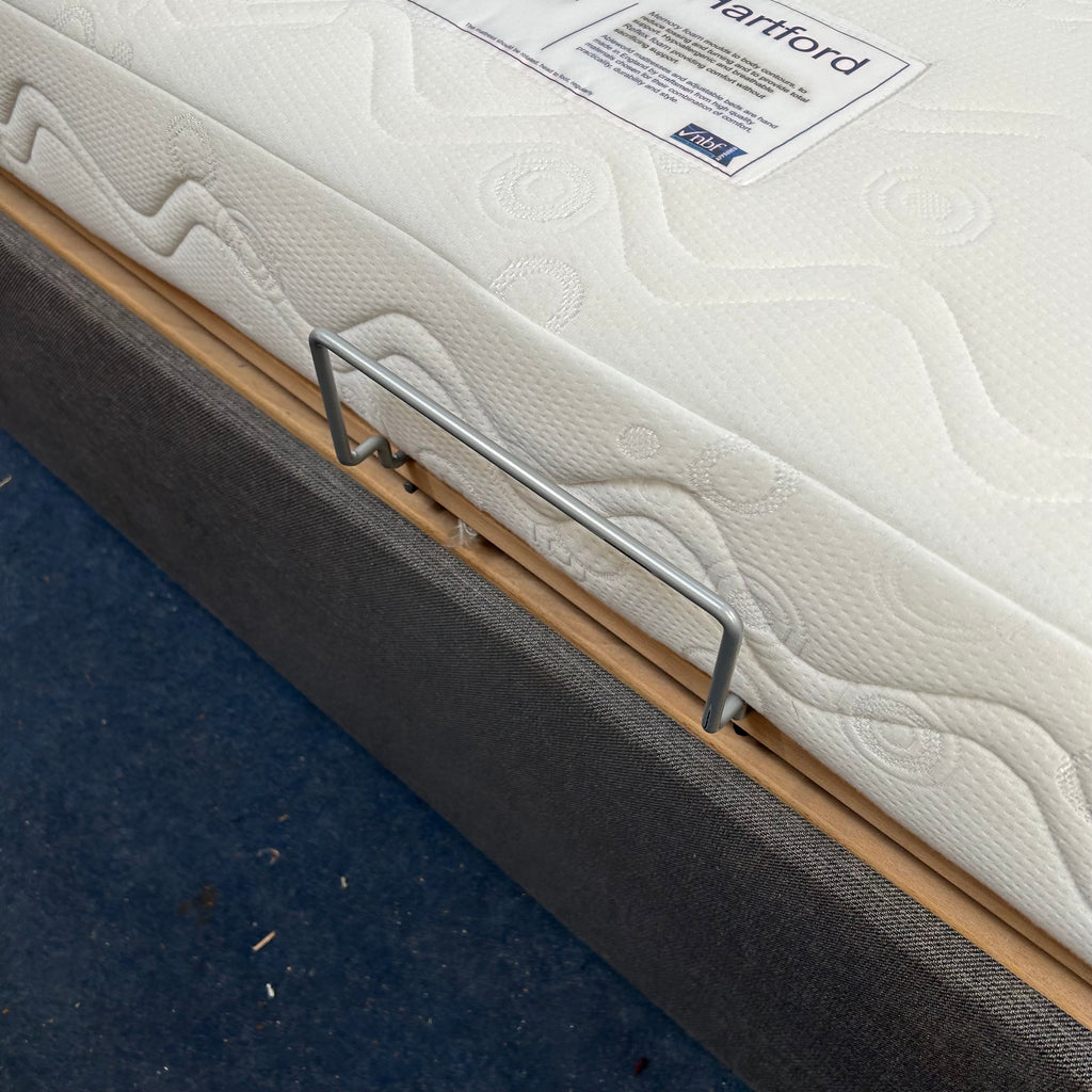 Charcoal grey electric bed with mattress, brown headboard and remote.