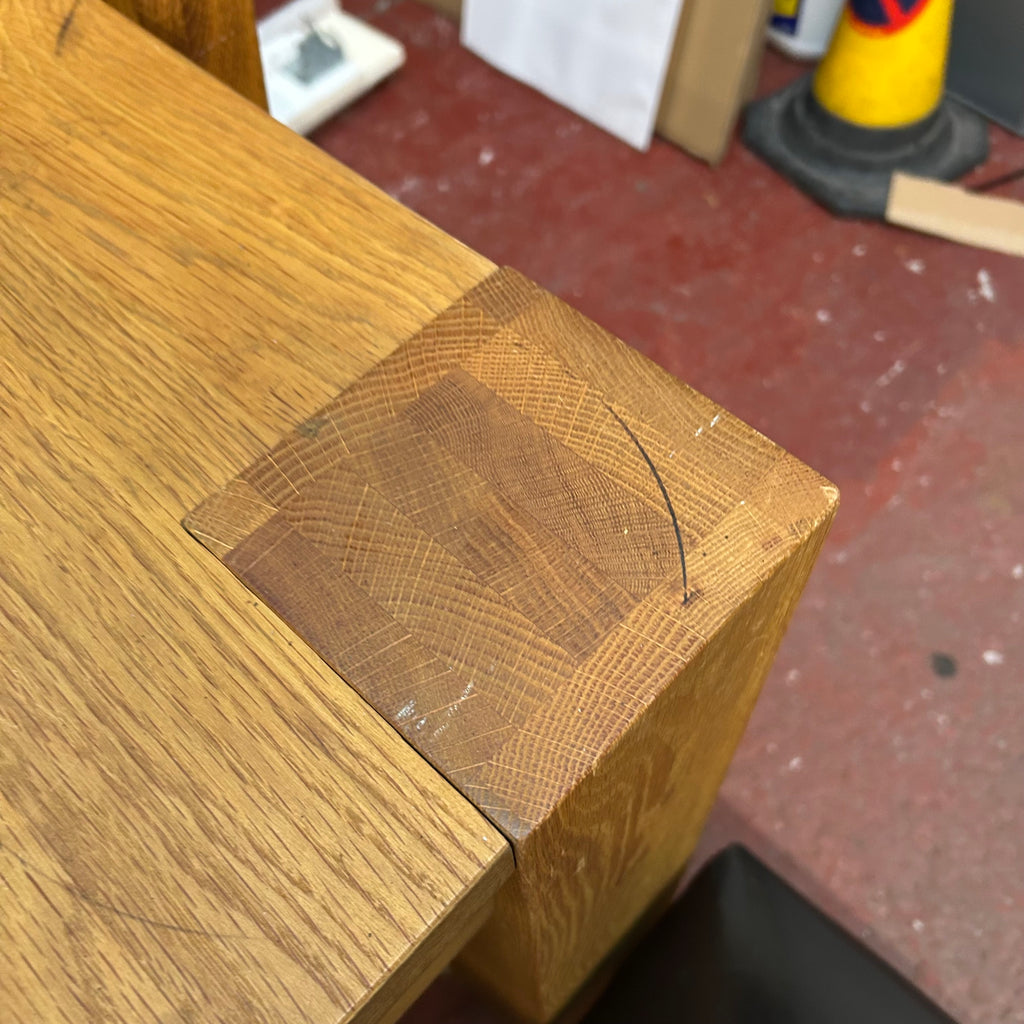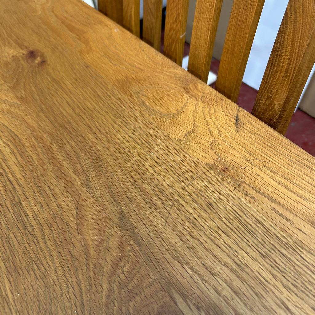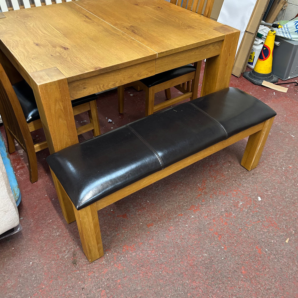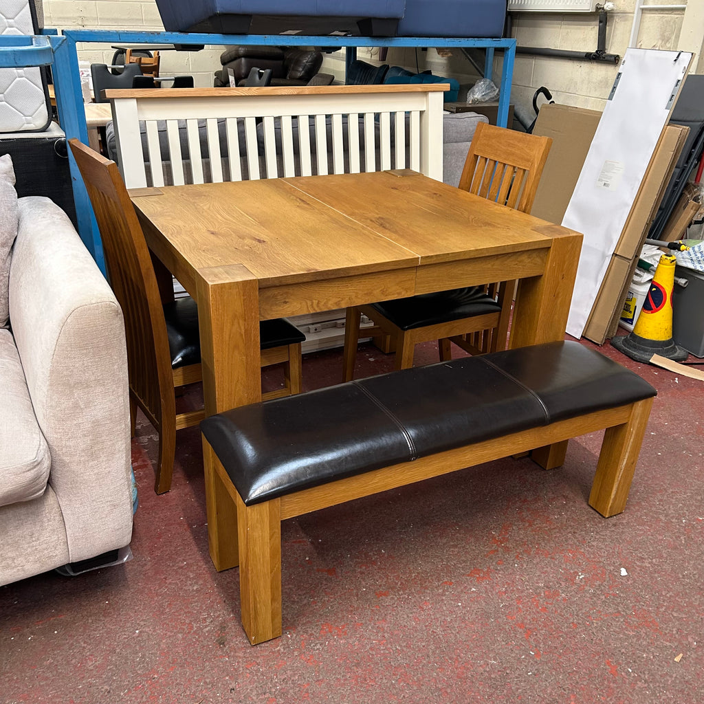 Solid oak dining table with 2x chairs and bench.