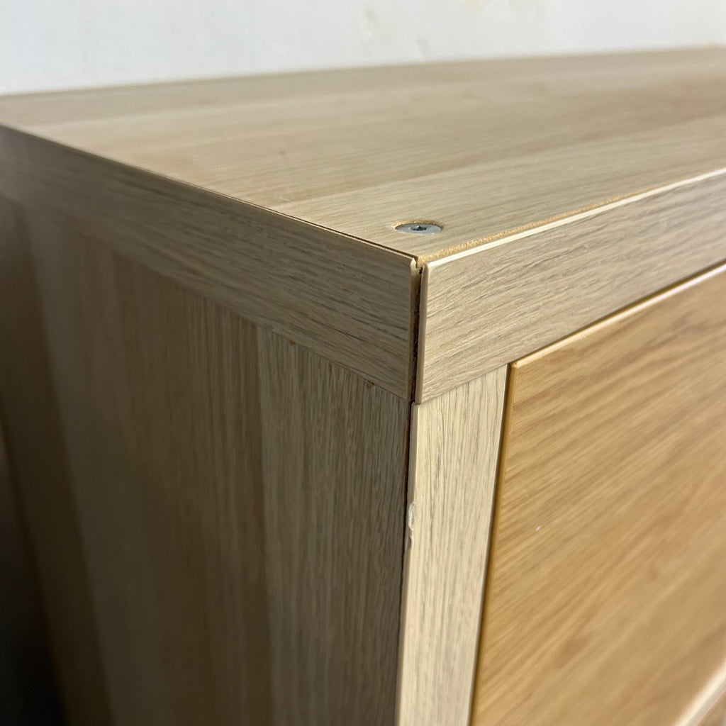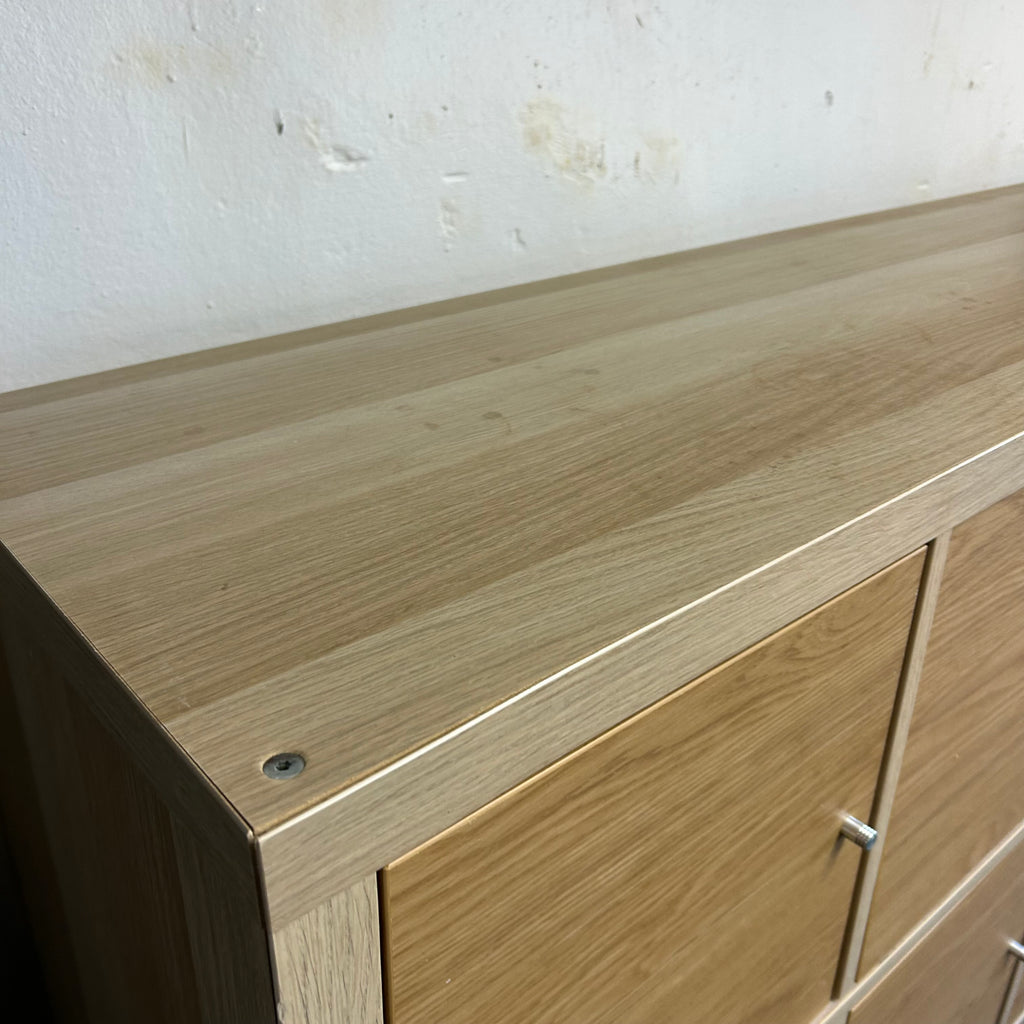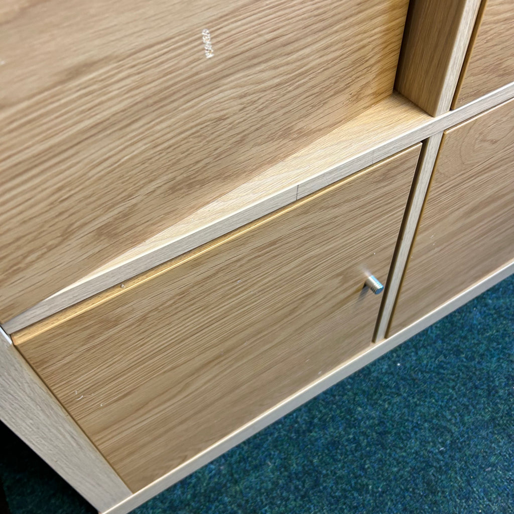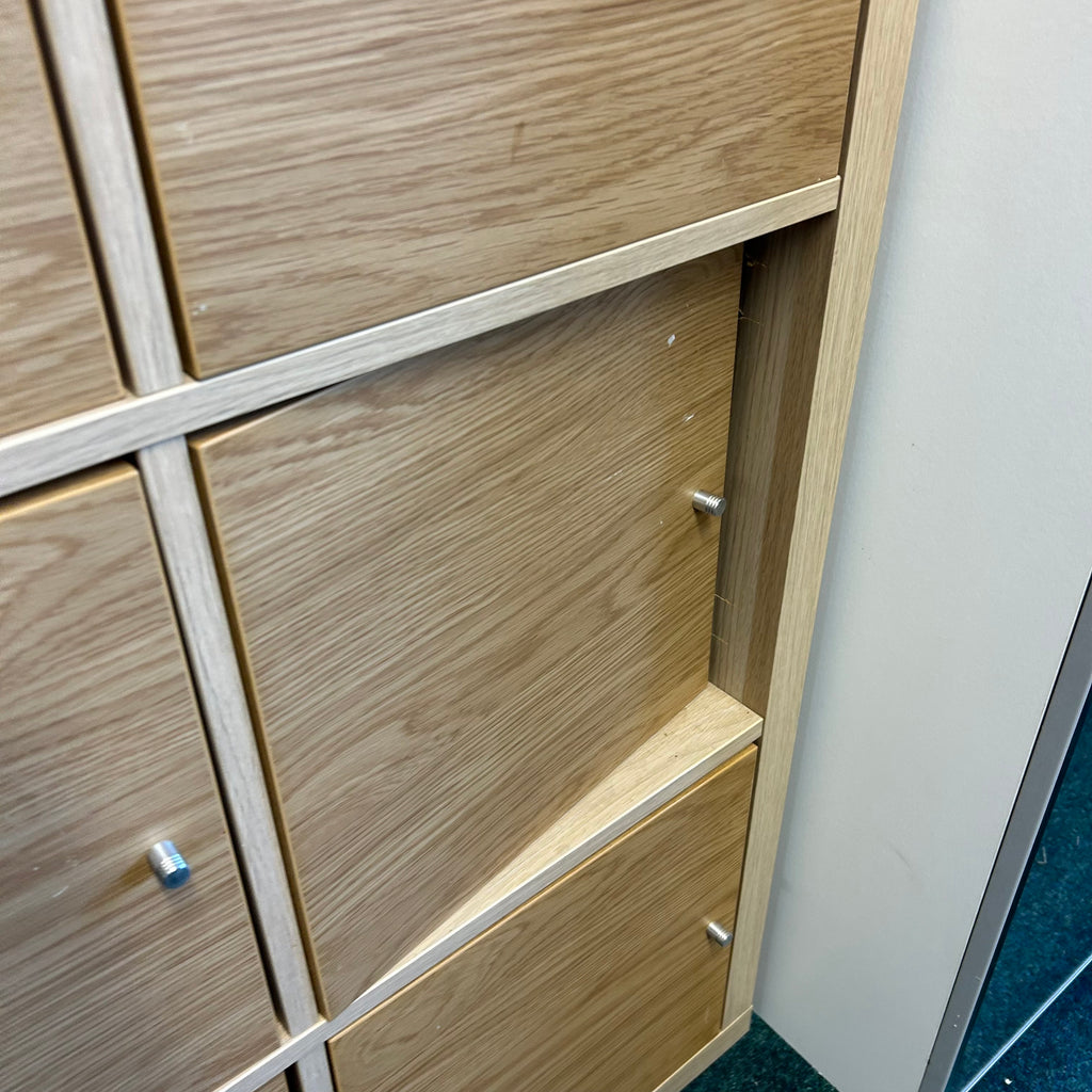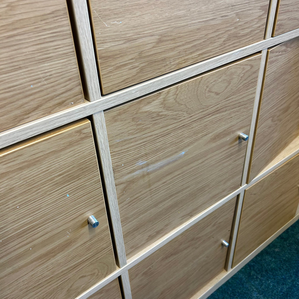 Wooden IKEA cube unit with cupboard doors.