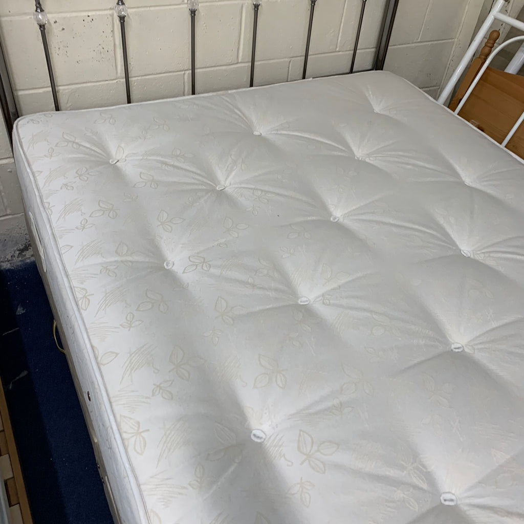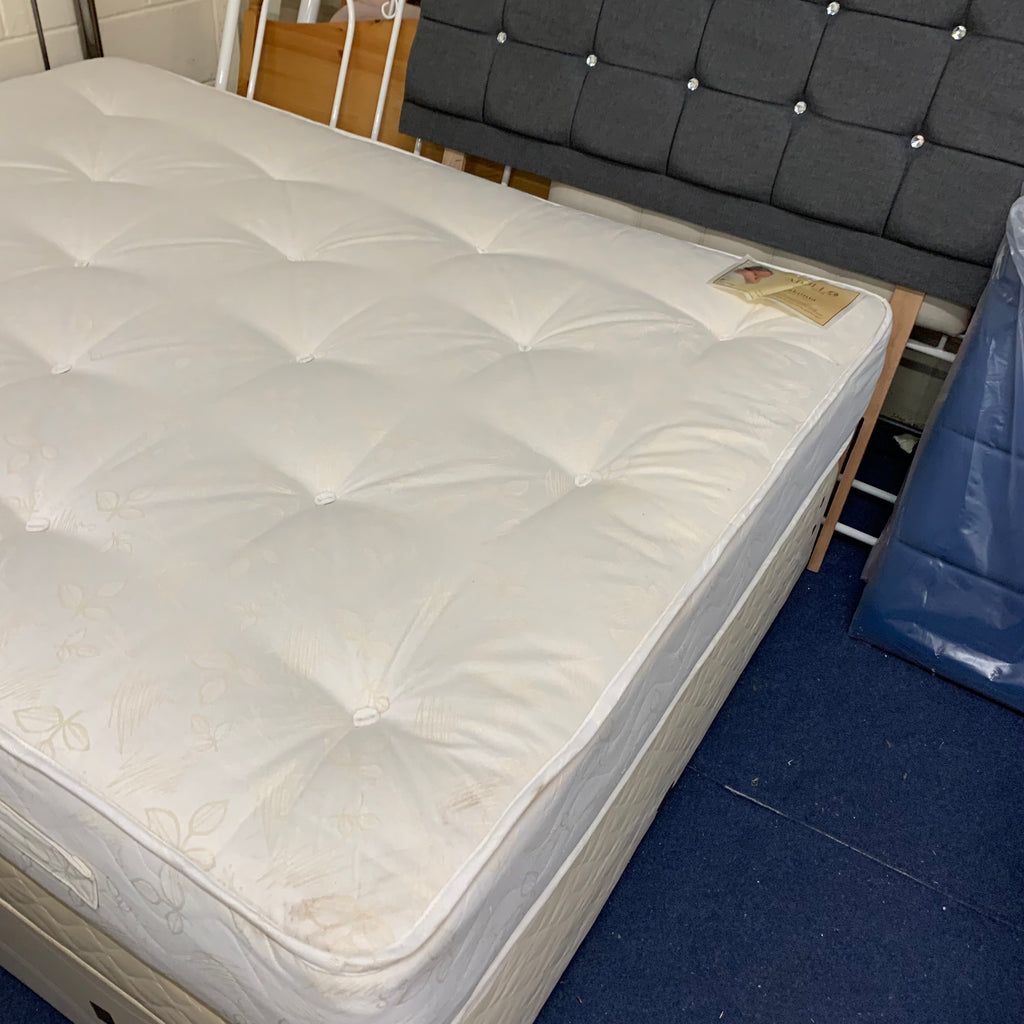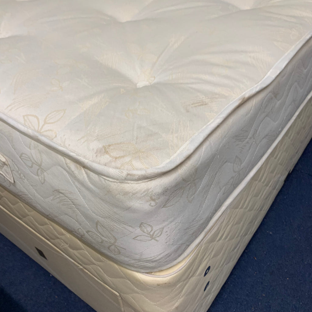Cream king size divan bed base with 4x drawers, metal headboard and mattress.