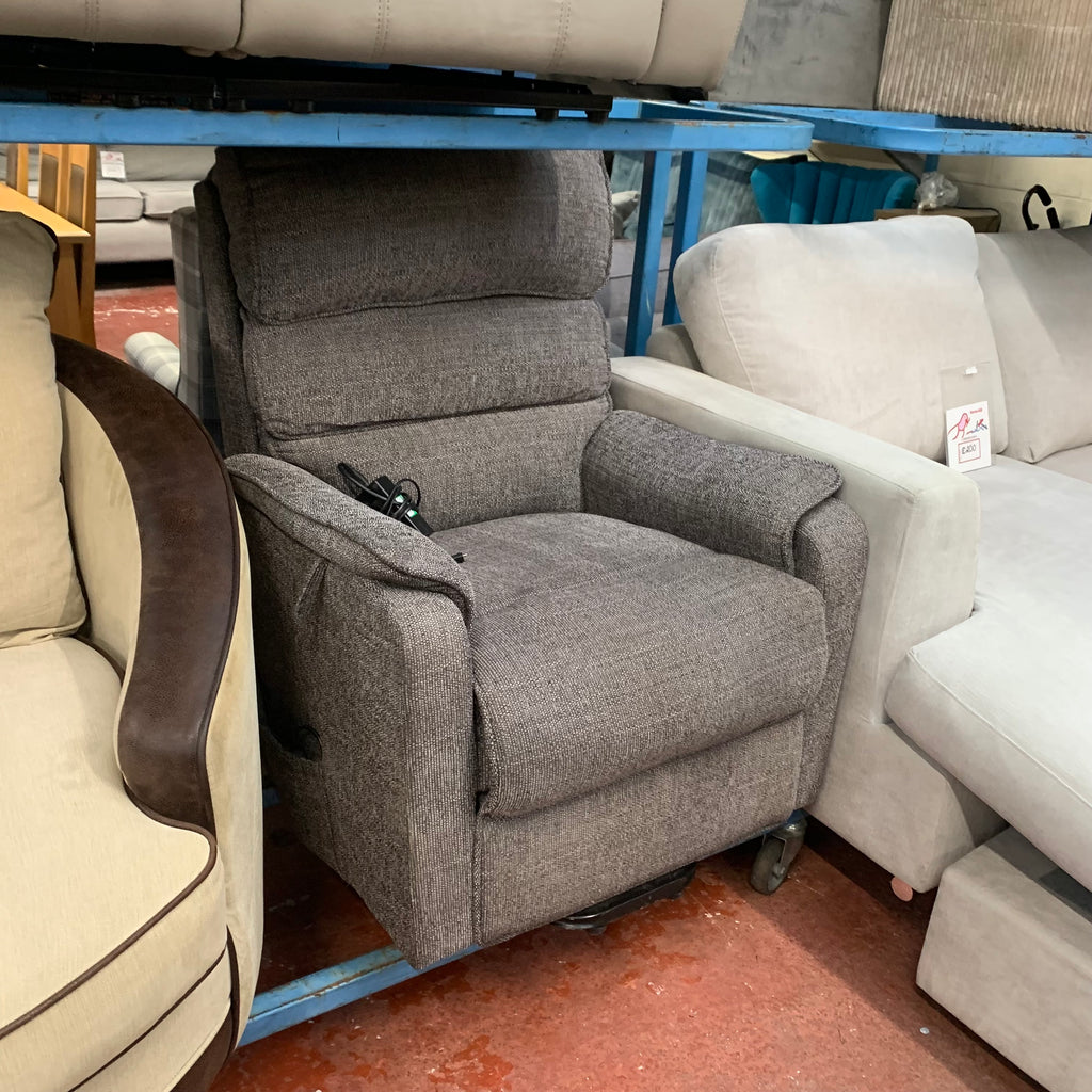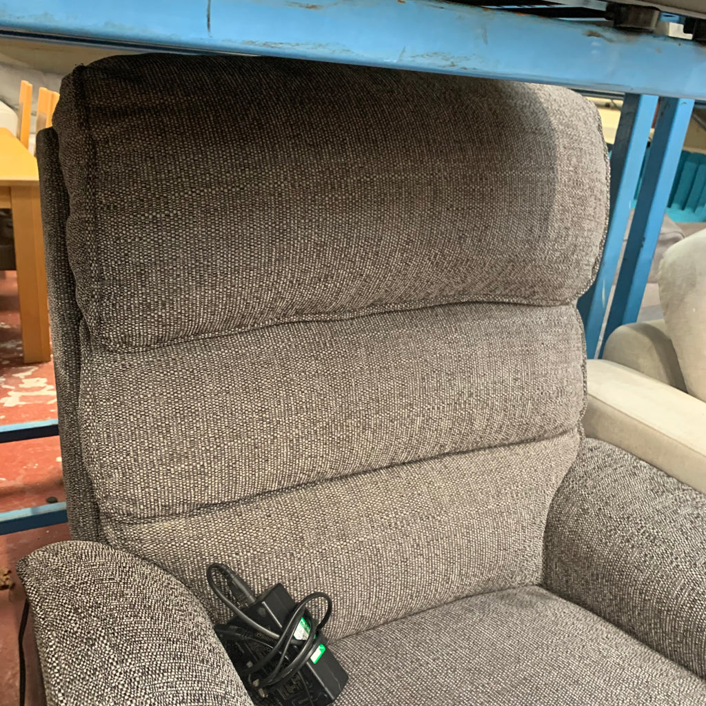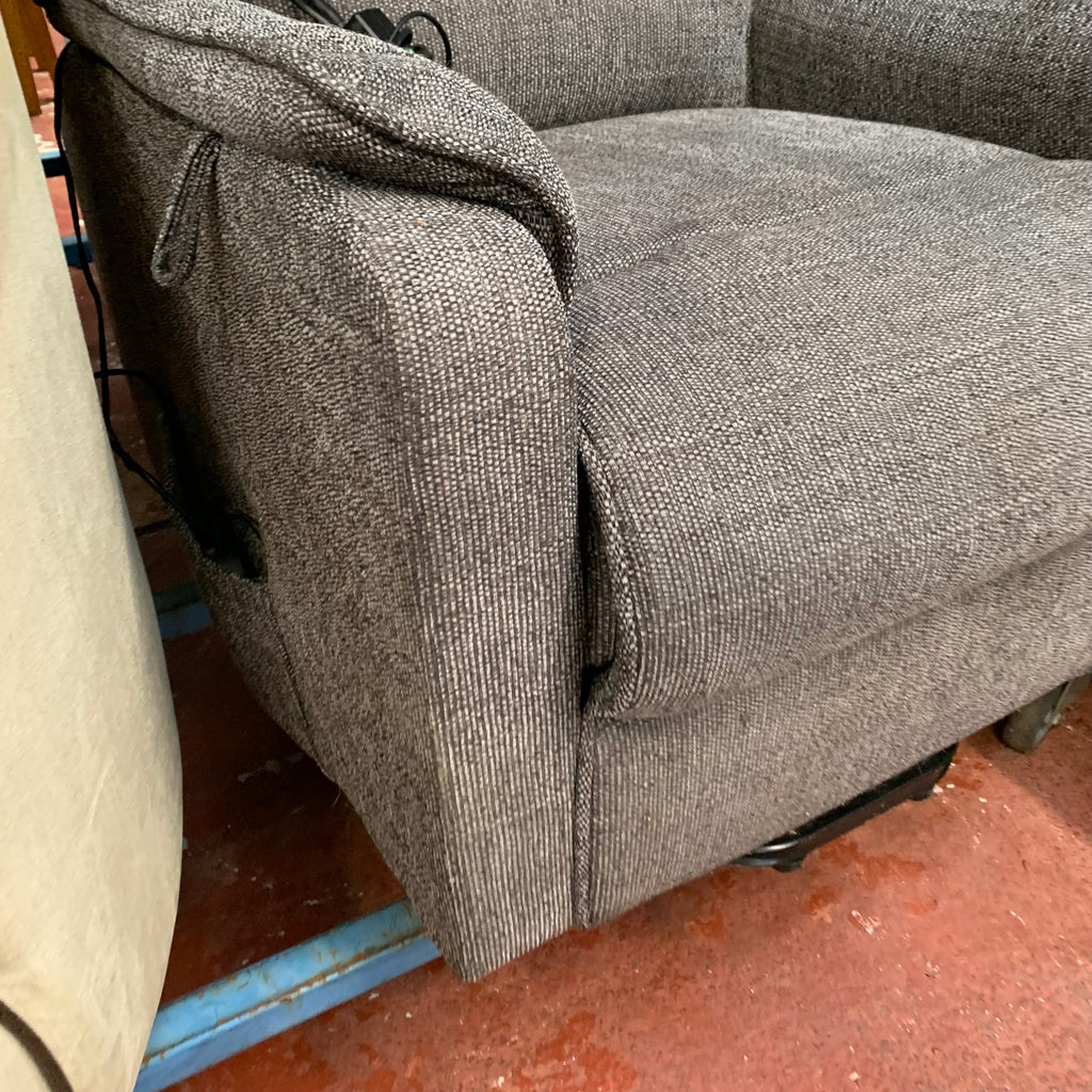 Grey rise and recliner armchair with remote.