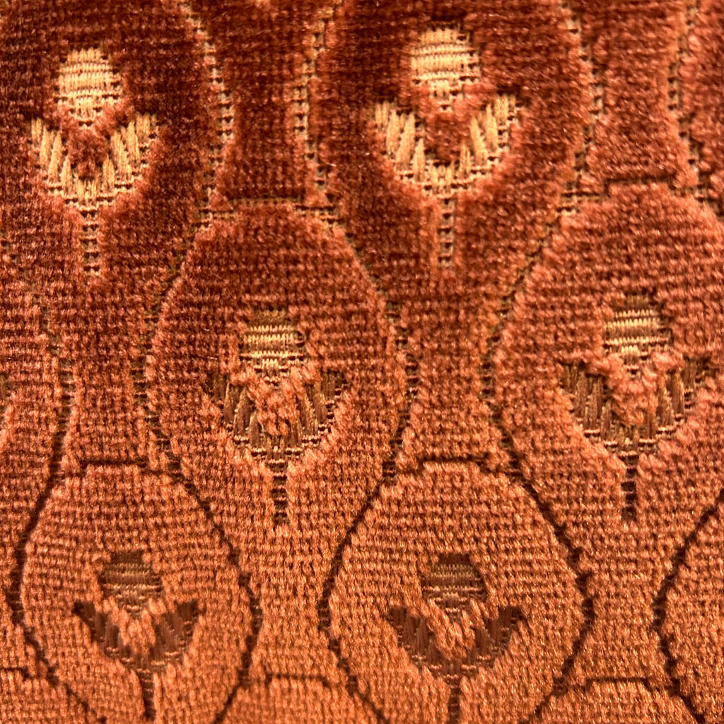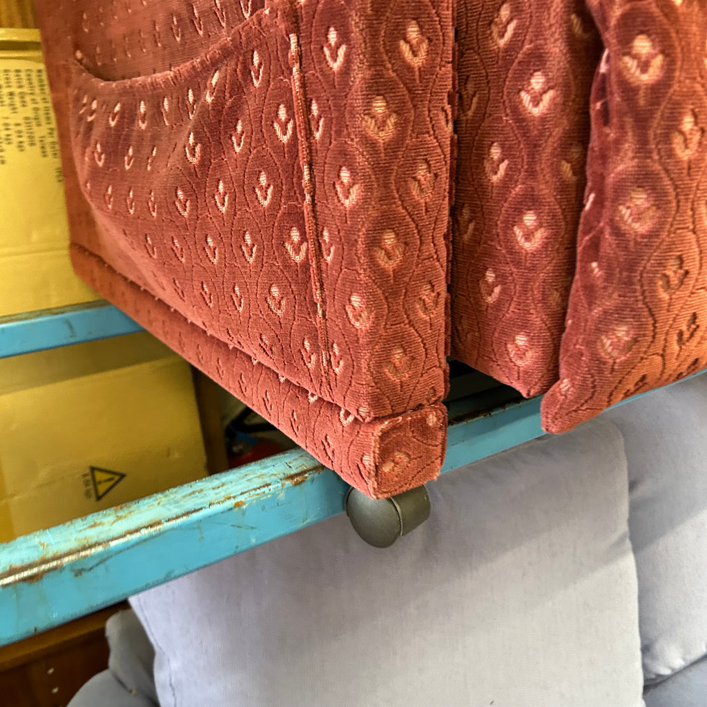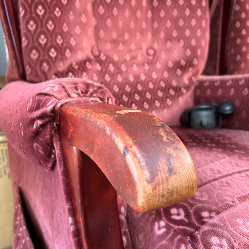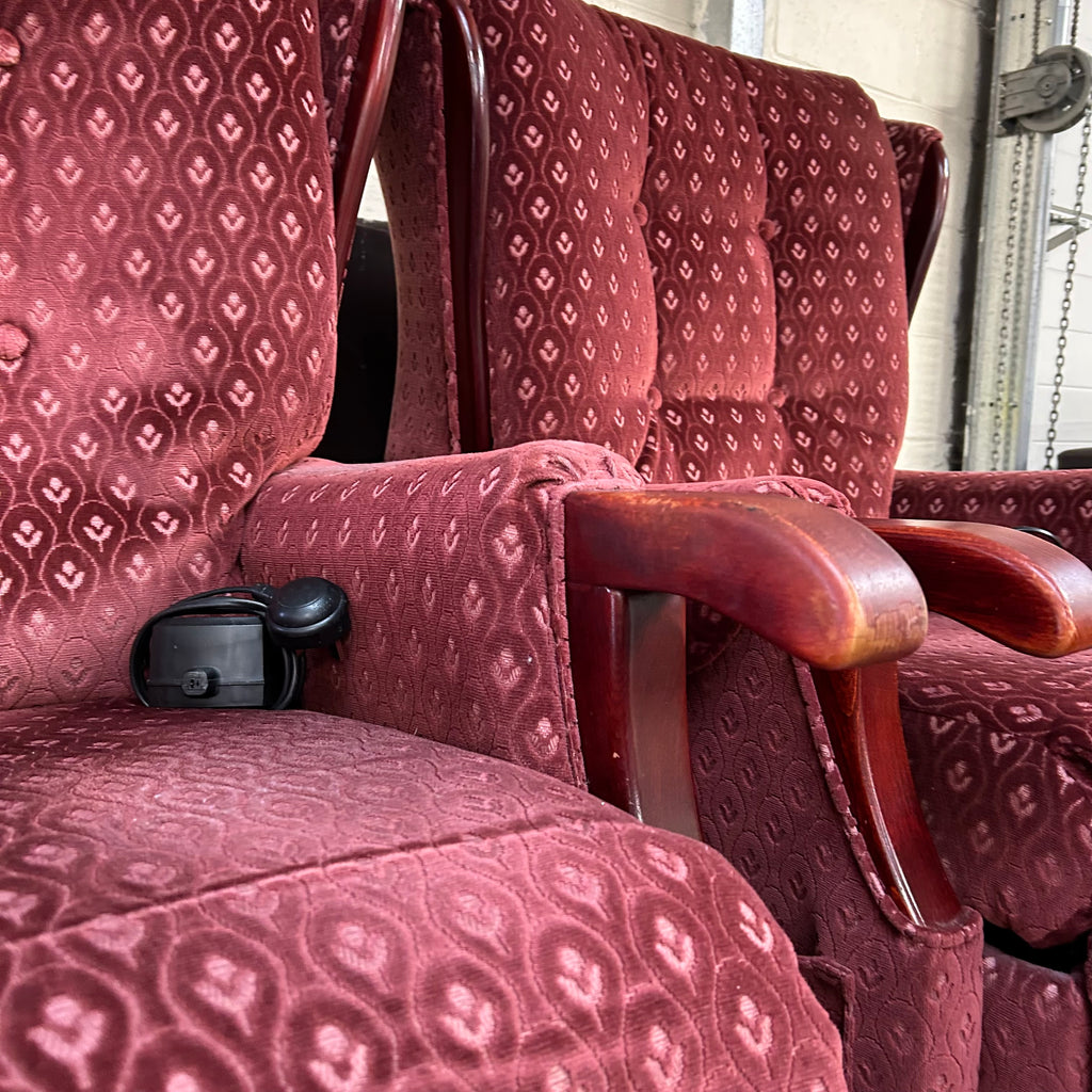 Red patterned rise and recliner armchair.