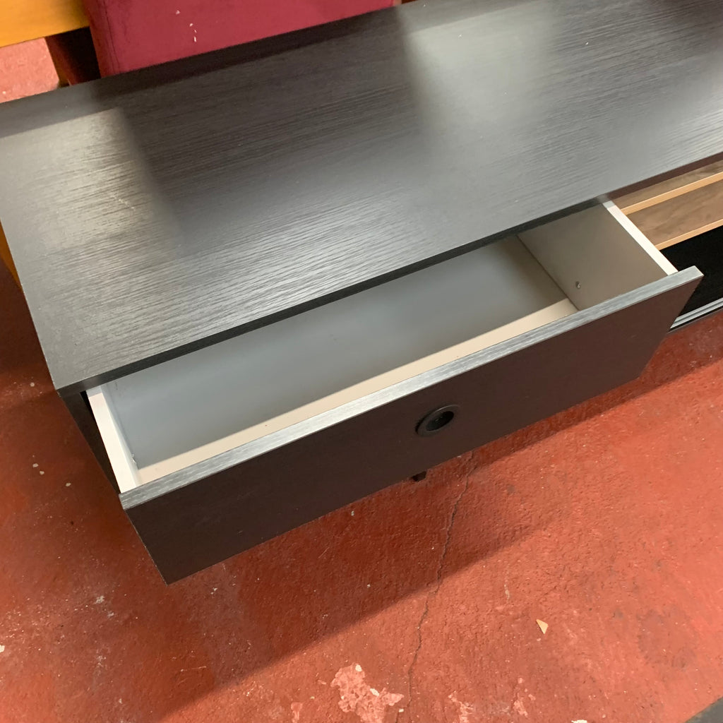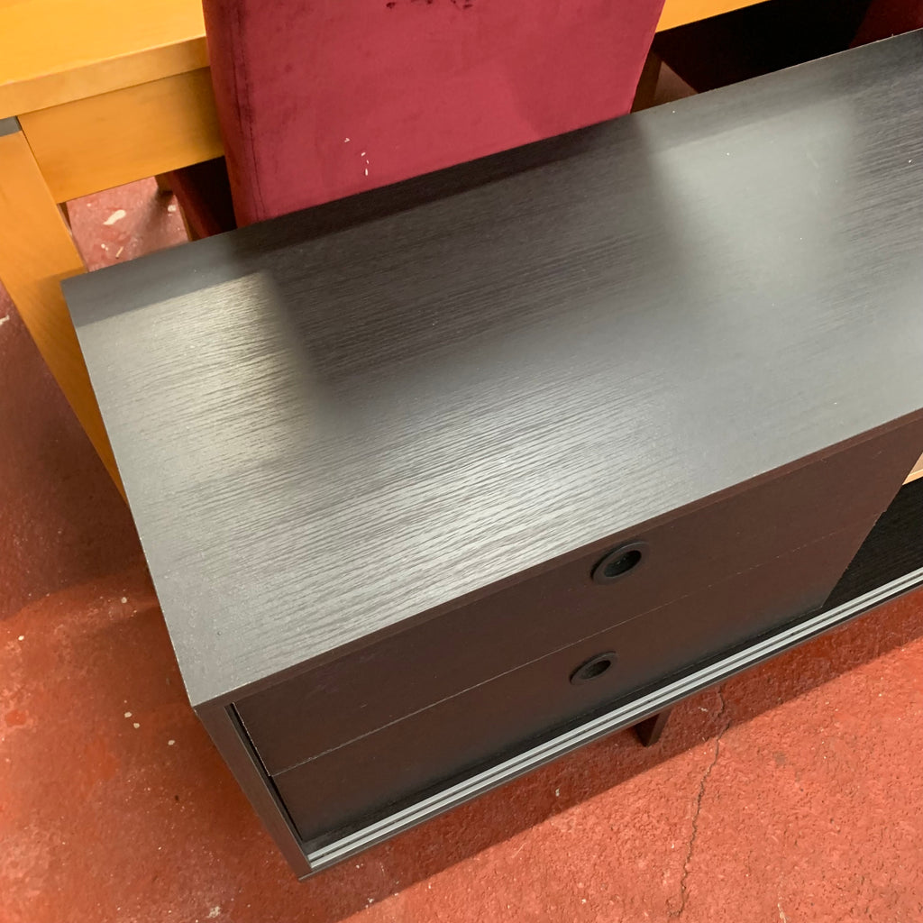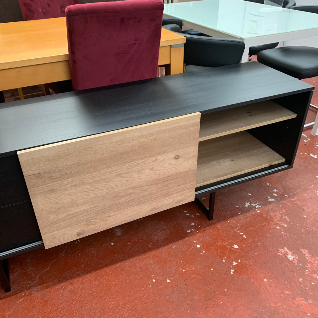 Black sideboard with 2x drawers and 1x wood sliding door.