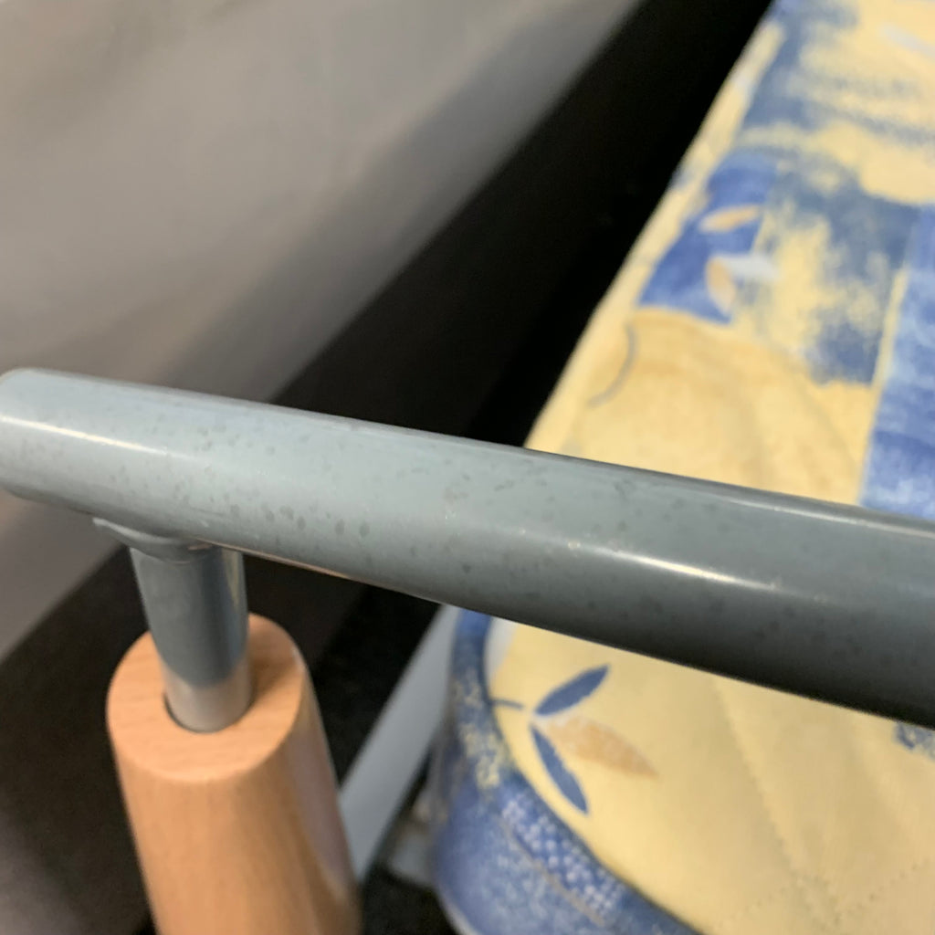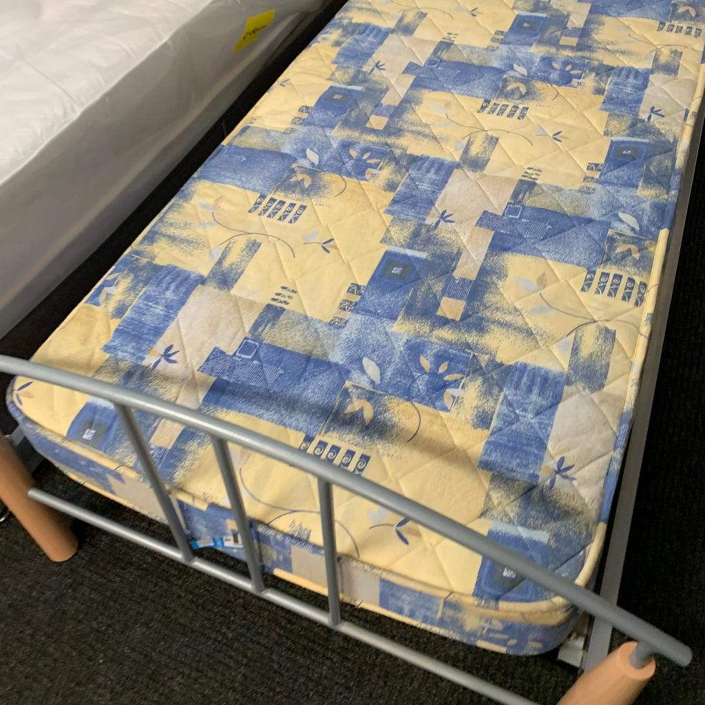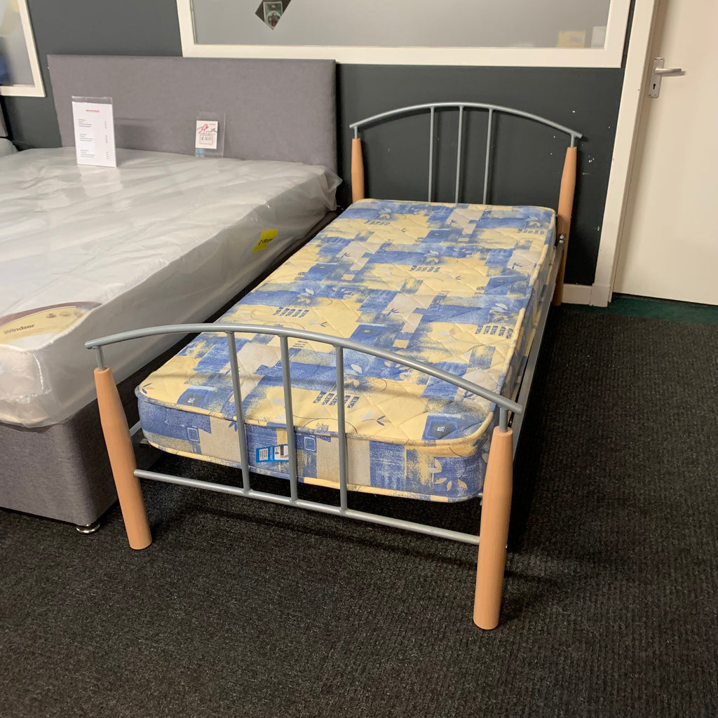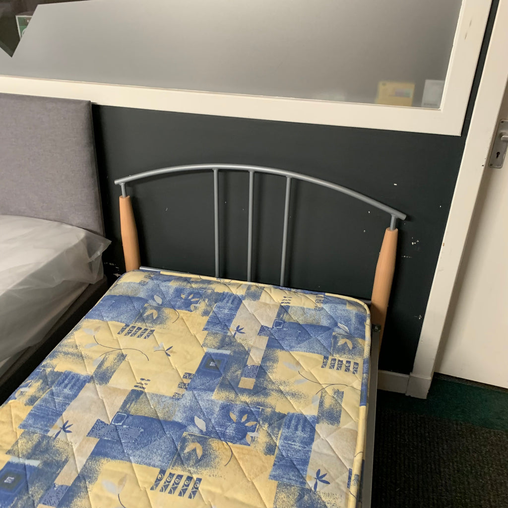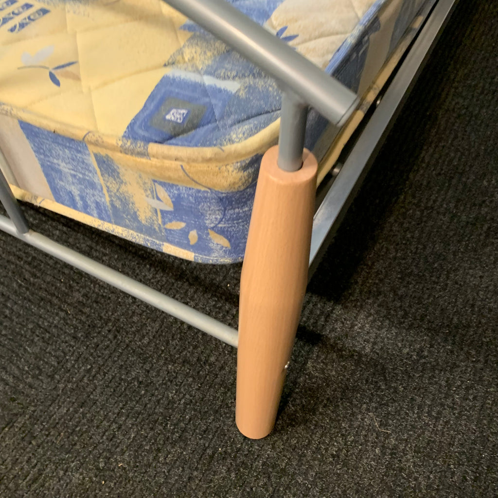 Single metal bed frame with wooden details and mattress.