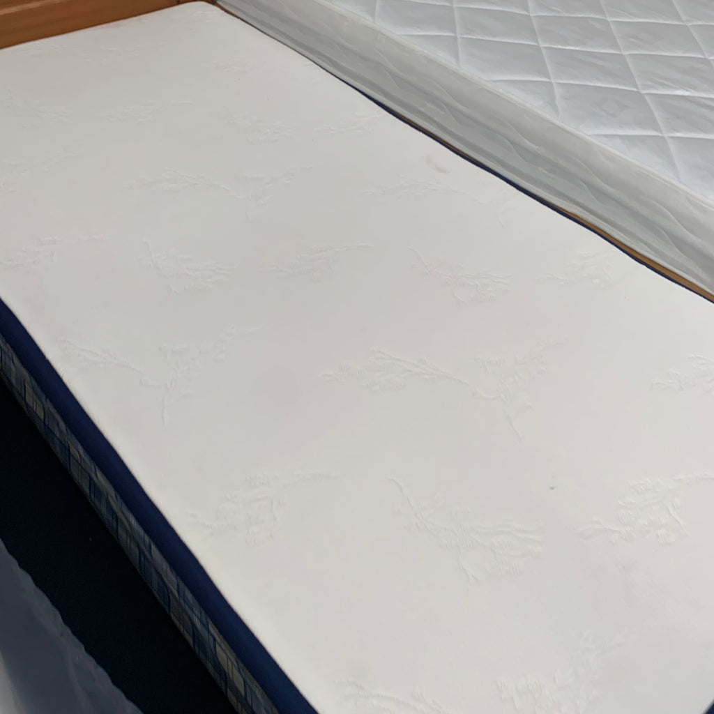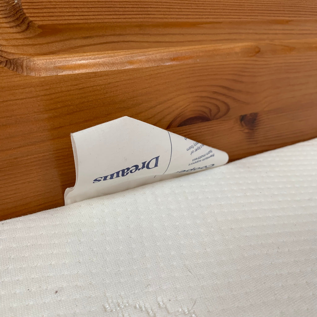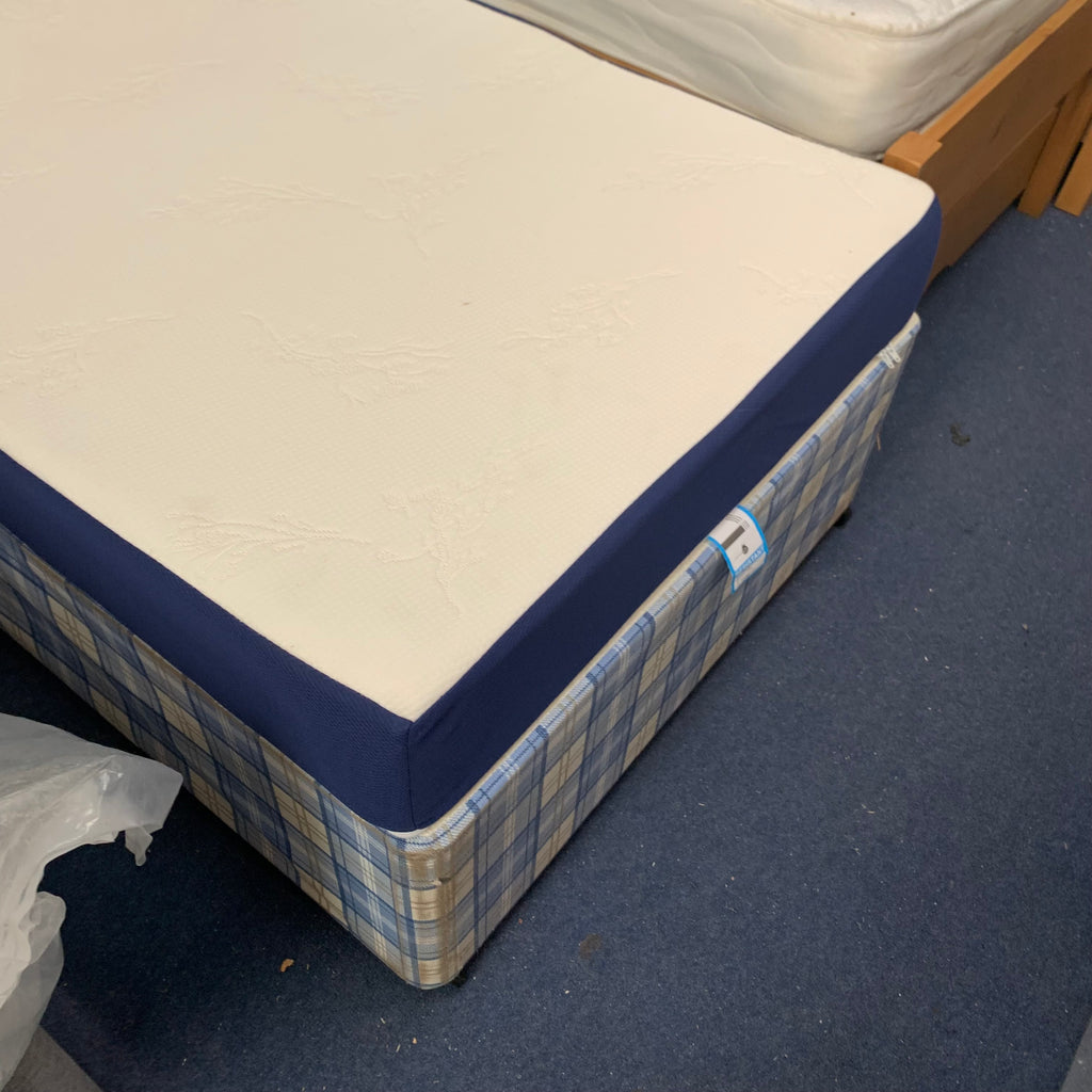 Blue checked pattern single divan bed base with wooden headboard and Dreams mattress.