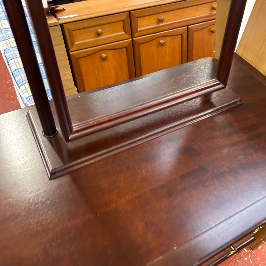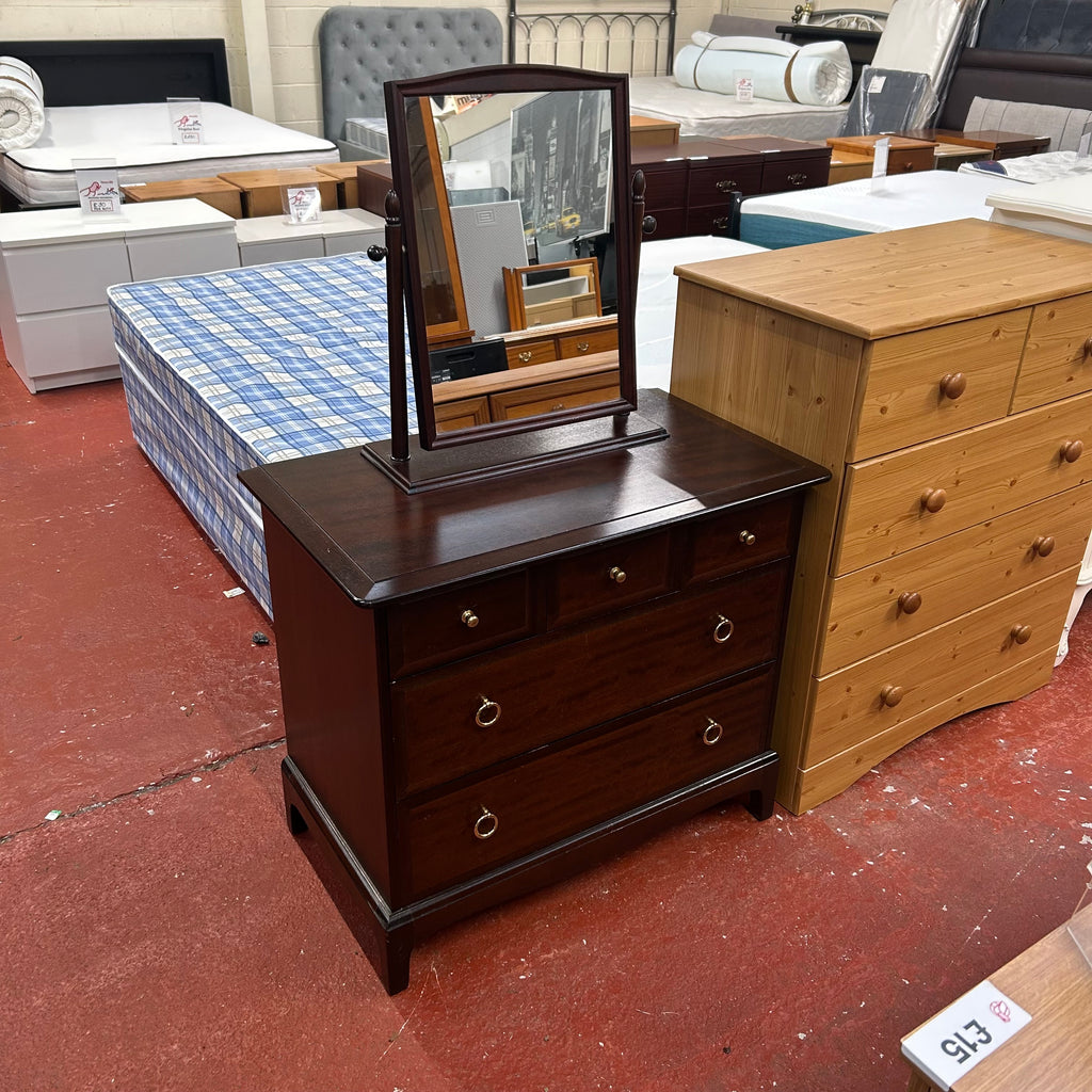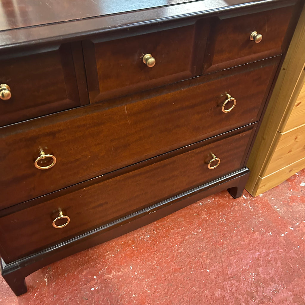 Dark wood Stag chest of 5x drawers and matching mirror.