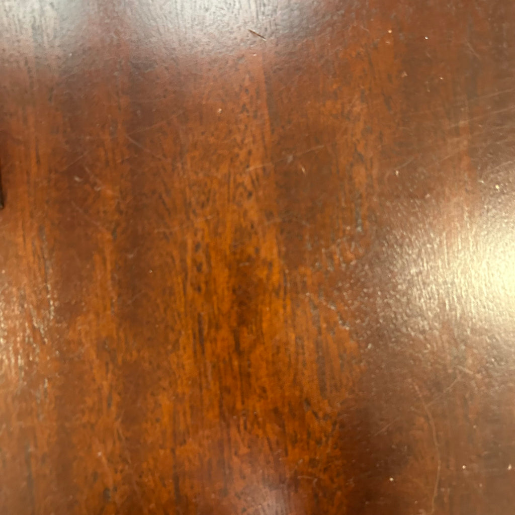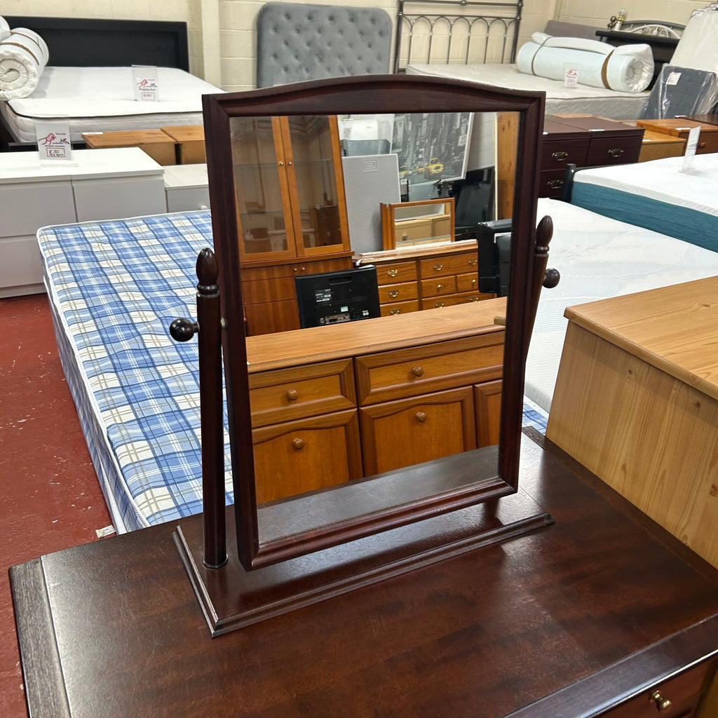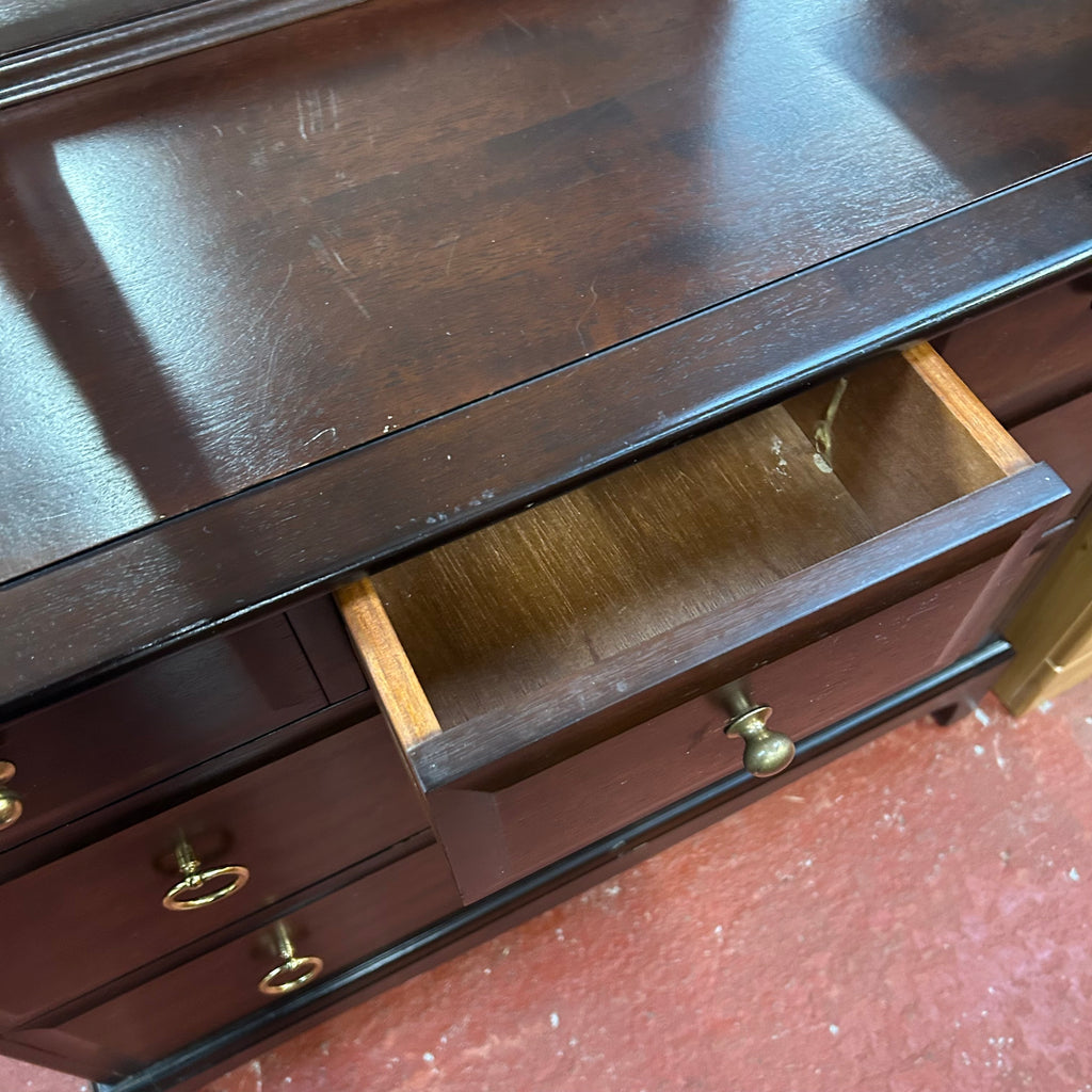 Dark wood Stag chest of 5x drawers and matching mirror.