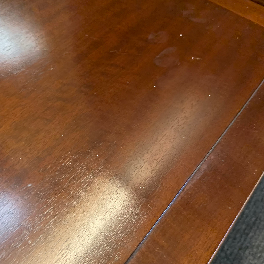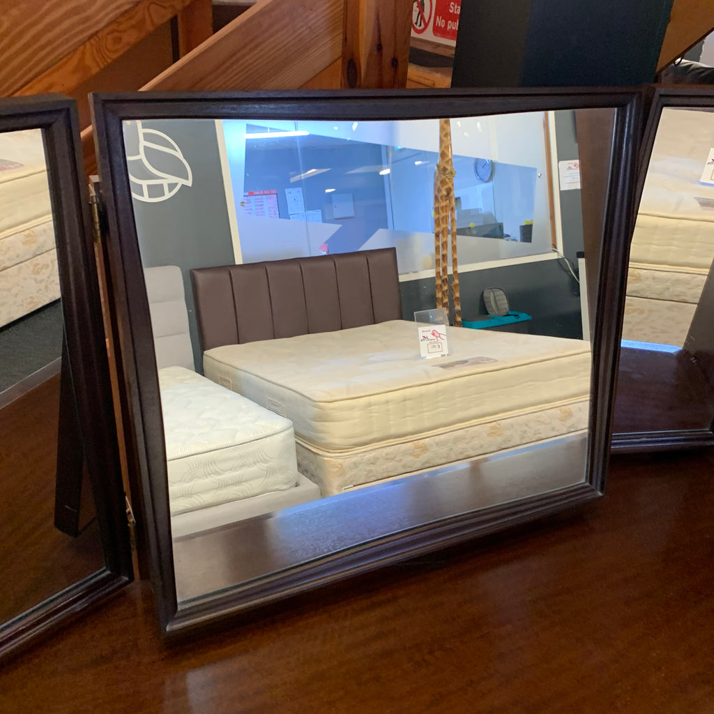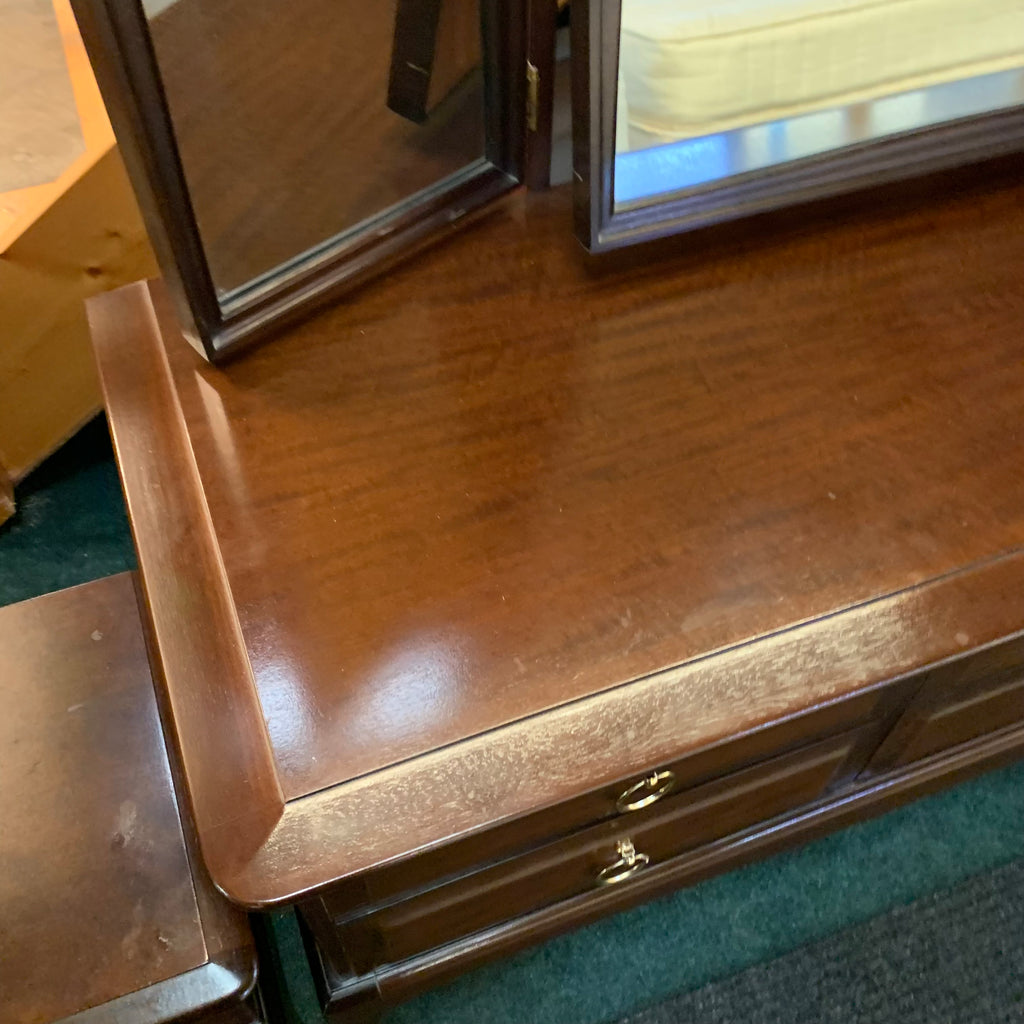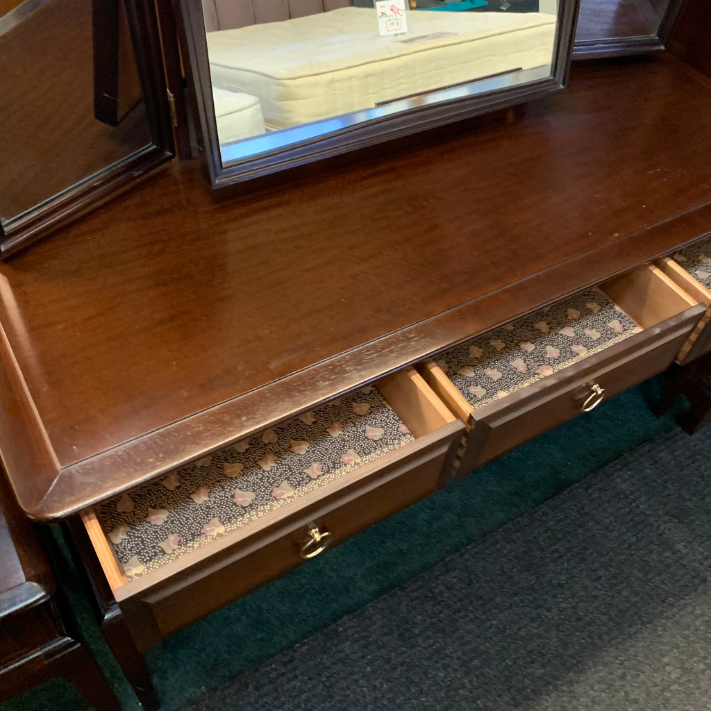 Dark wood Stag dressing table with 6x drawers and large mirror.