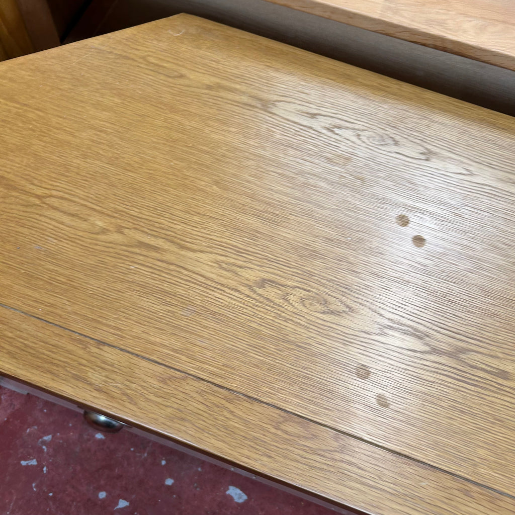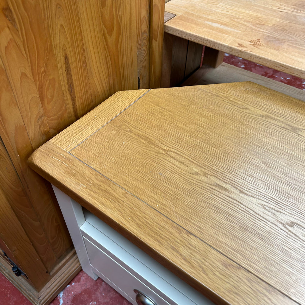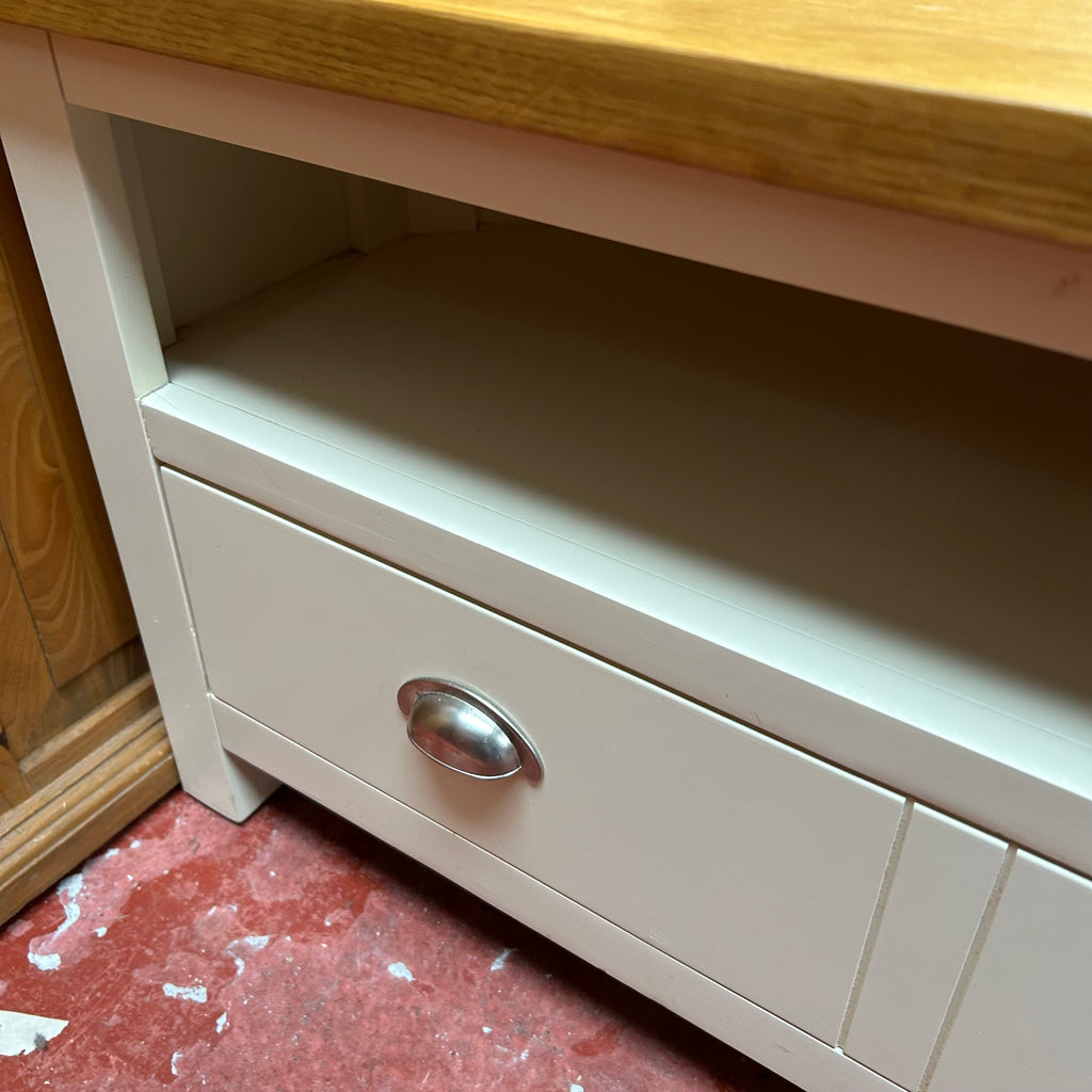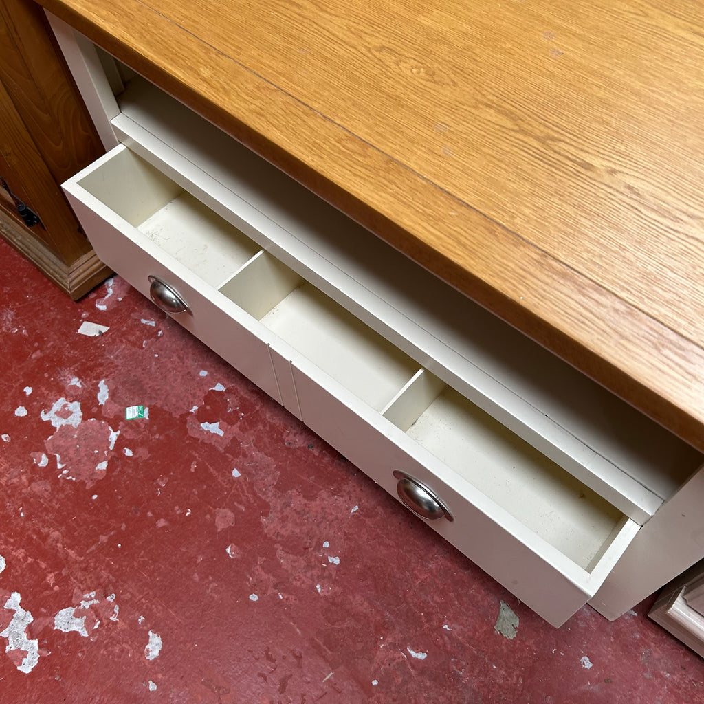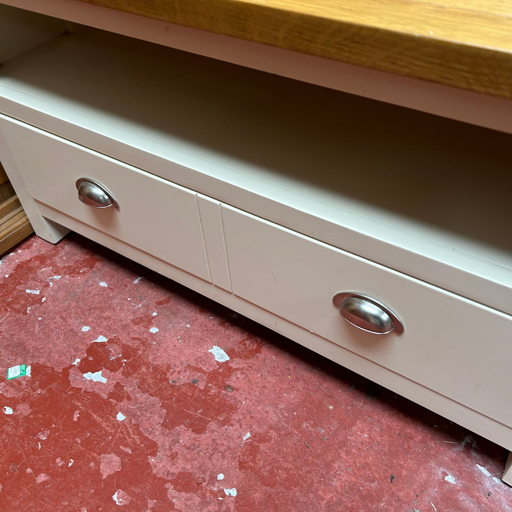 Cream TV unit with wooden top.